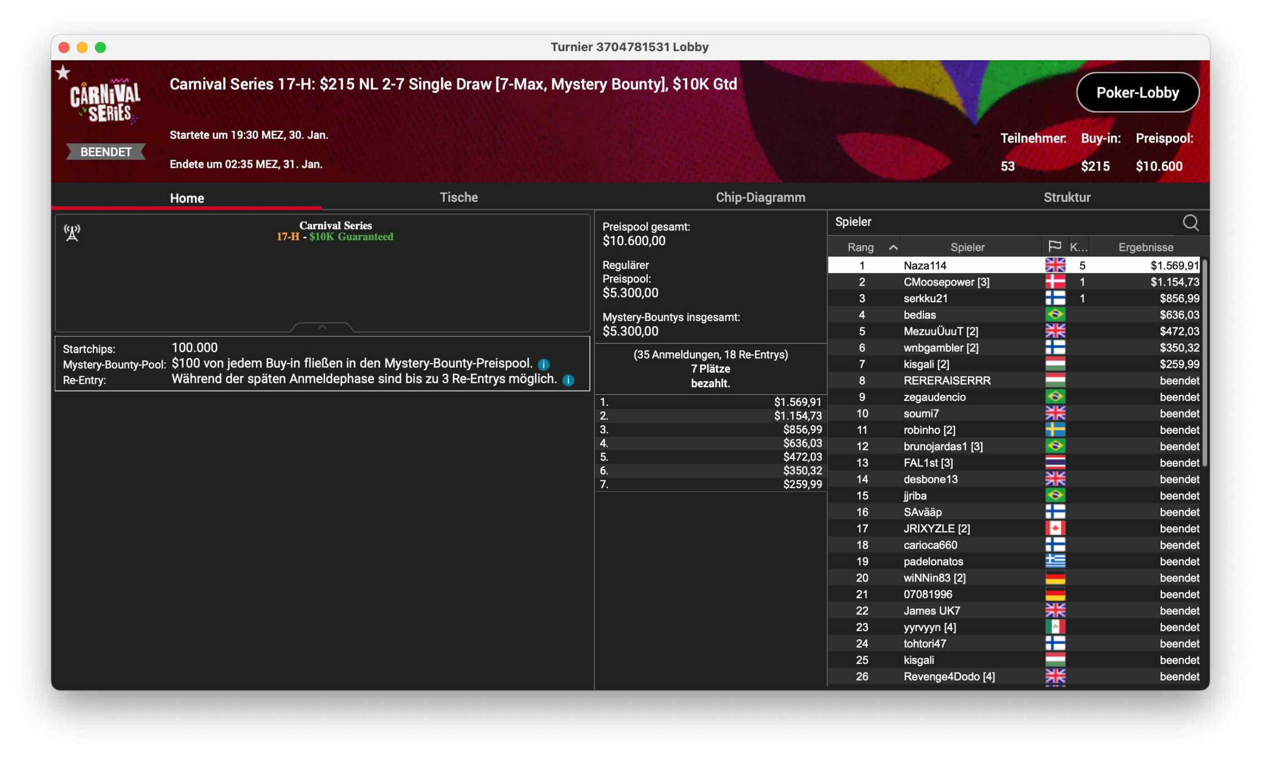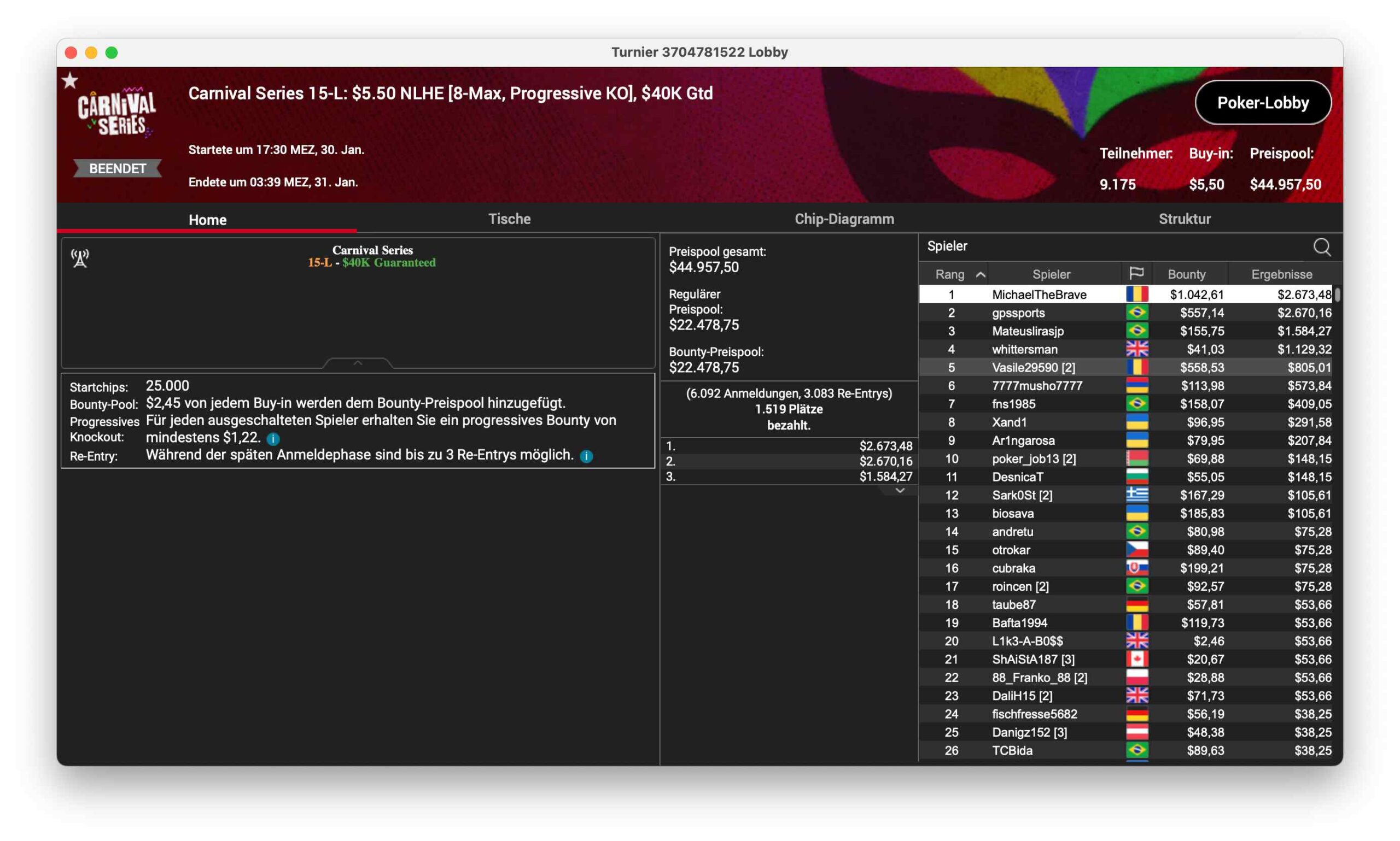 Bei der Carnival Series konnte der deutsche Spieler „steven2188“ siegen. Er schnappte sich das $44 NLHE, Heads Up Turbo Zoom PKO, mit 1.085 Entries und $43.400 Preispool. Der Sieg brachte $4.545.