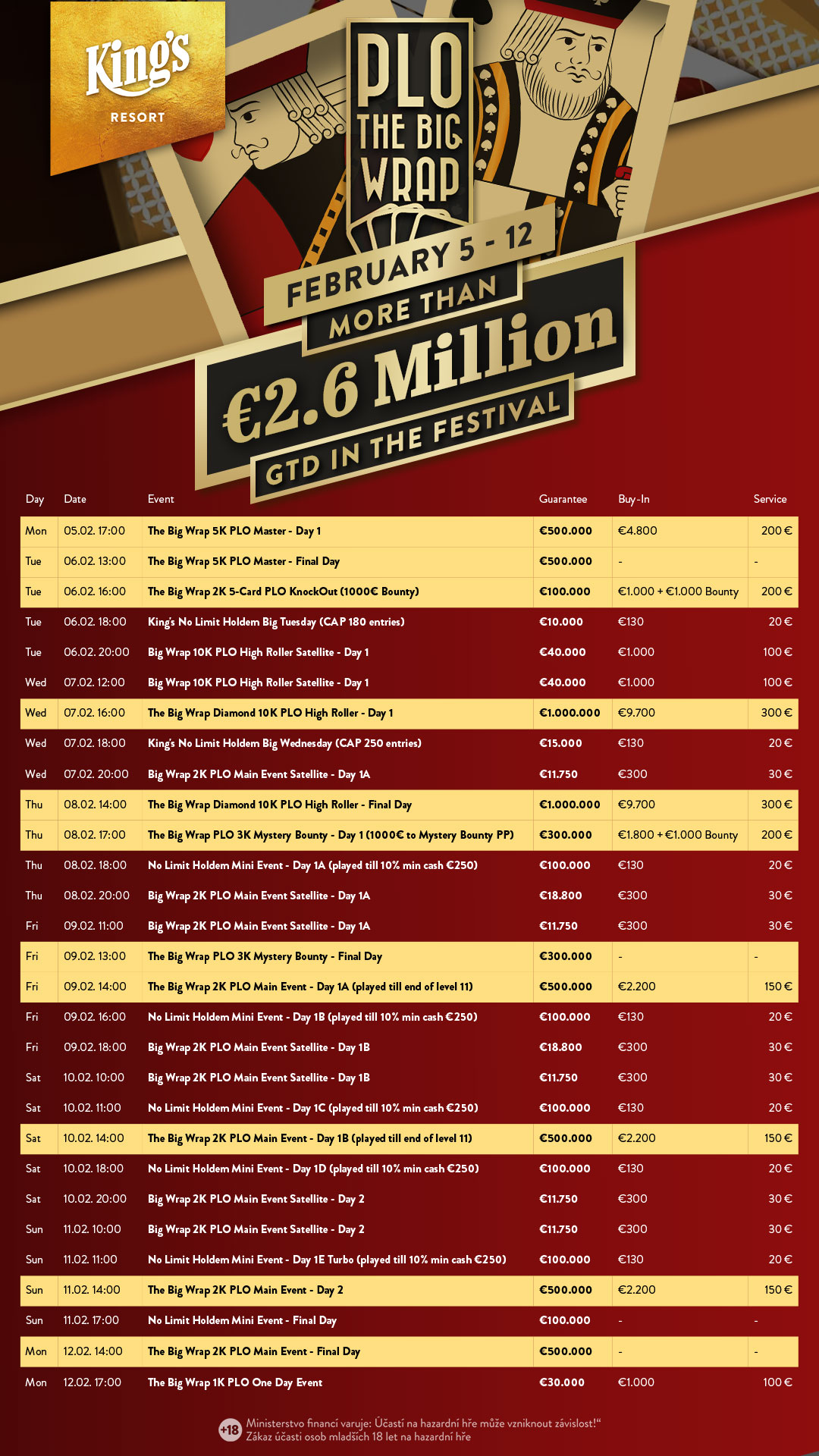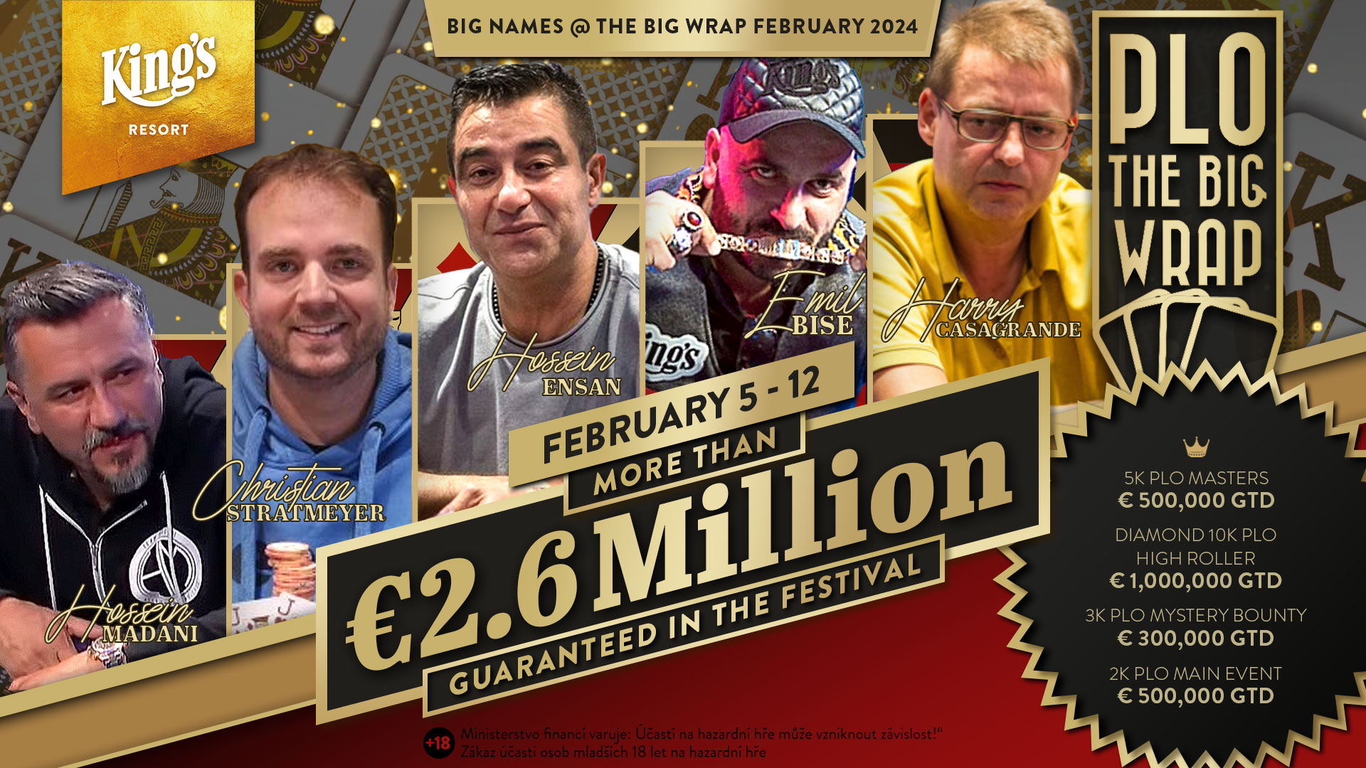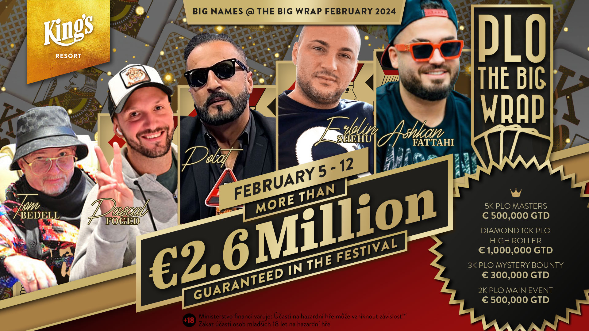 Das wiederkehrende Pot Limit Omaha Highlight im King’s Resort – das PLO The Big Wrap – steht wieder vor der Tür. Mehr als €2.600.000 an Preisgeldern wird bei den Turnieren zwischen 05. und 12. Februar garantiert und es haben sich eine lange Reihe bekannter Namen angekündigt.