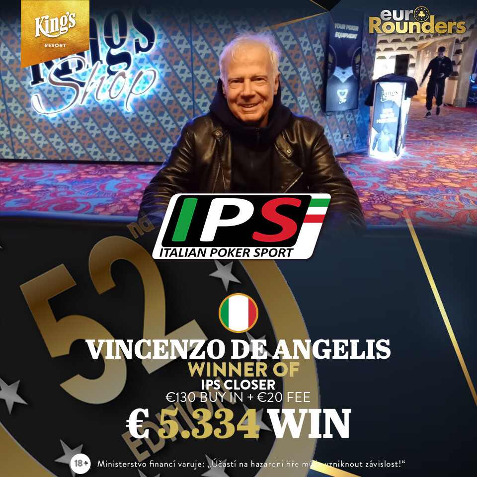 Wie bei so vielen Events im King’s Rozvadov waren im Preisgeld auch Plätze für Clement Cure (FRA, 4., €1.978) und Twitch-Kommentator des vom King’s Pokerroom „KIKINHO“ (CRO, 13., €389) reserviert. Auch zwei deutsche Spieler schafften es ins Geld: Matthias Kribben landete für €289 auf Platz 19, während sein Landsmann „Mr. XXX“ seinen nächsten Final Table einfuhr und für Platz 5 am Ende €1.589 kassierte. Der Sieg und €5.334 gingen an Vincenzo de Angelis aus Italien, der sich im Heads-Up gegen „MED“ (€3.635) aus Marokko durchsetzte.