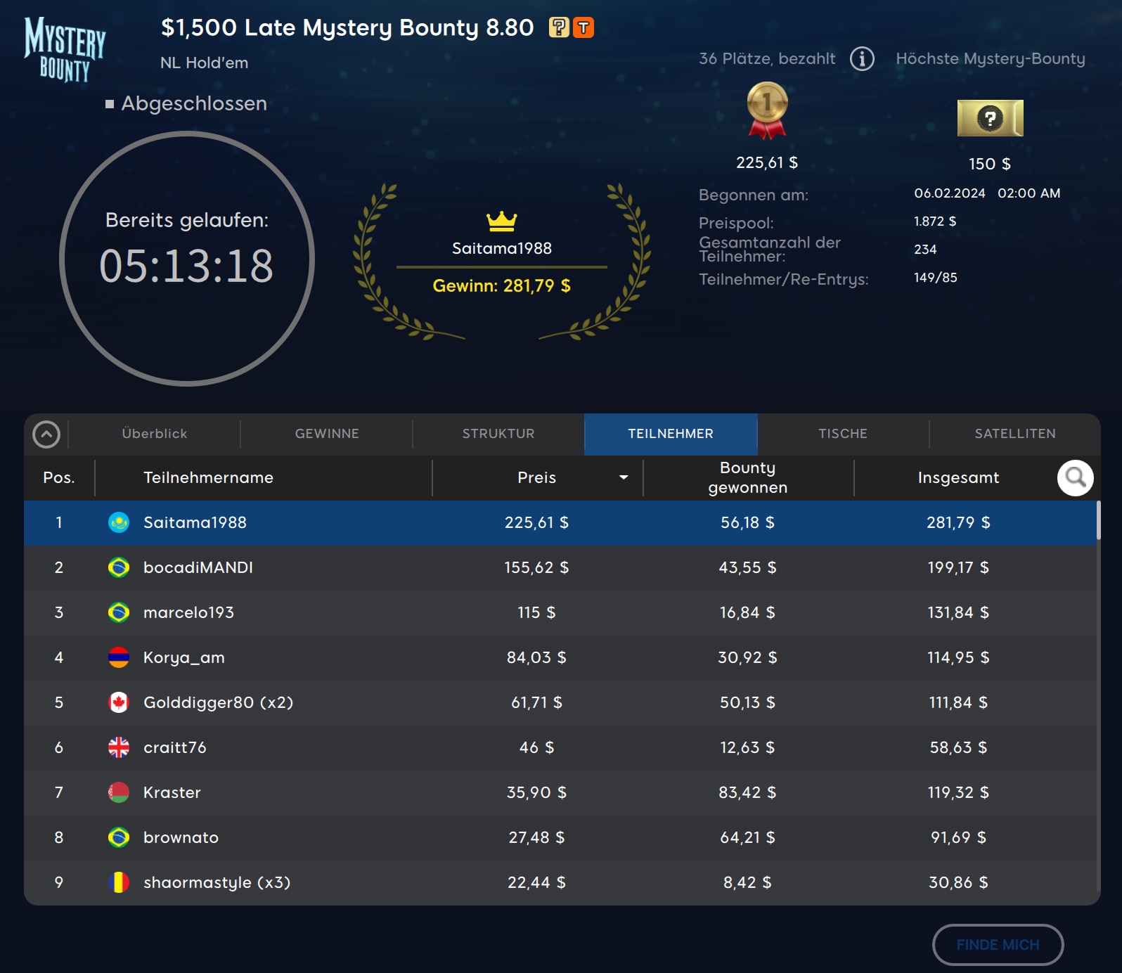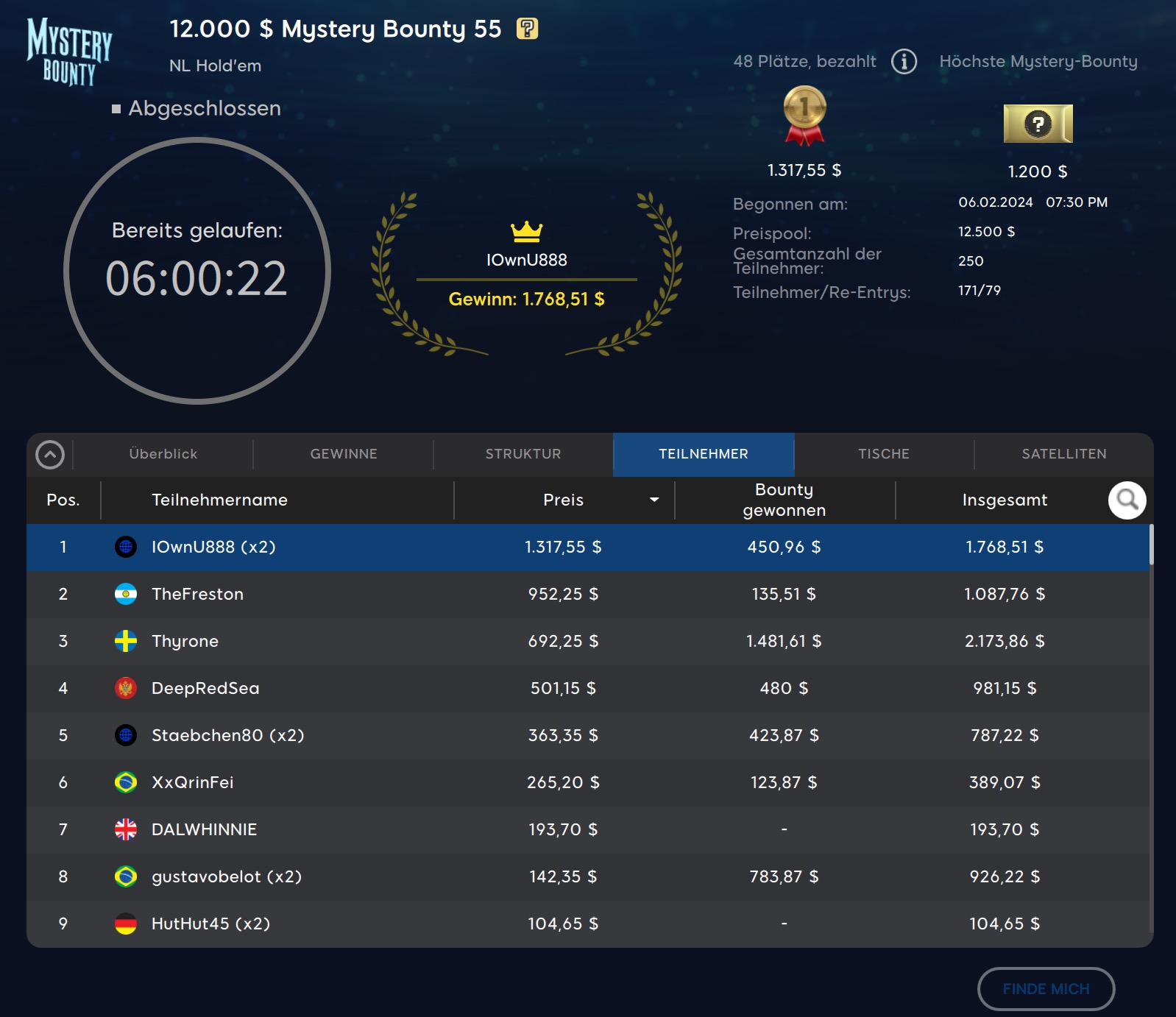 Das Turnier mit dem größten Preispool des Tages war das $12.000 Mystery Bounty mit einem Startgeld von $55. Bei so einem Turnier dürfen die 888poker-Regulars natürlich nicht fehlen, und so war es kein Wunder, das mit „IOwnU888“ ein Vielspieler das Turnier unter 250 Total Entries gewann. Dafür gab es neben der virtuellen Krone insgesamt $1.768 Preisgeld. Aus dem deutschsprachigen Raum landeten weiter „Staebchen80“ auf Platz 5 ($787) und „HutHut45“ auf Platz 9 ($104).