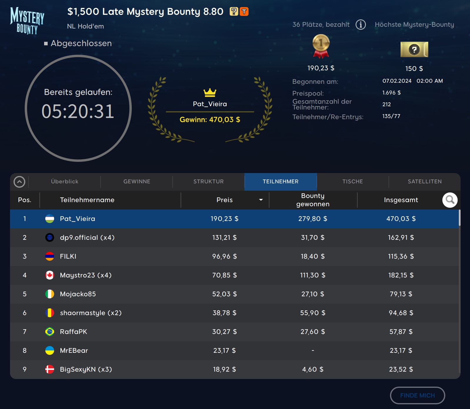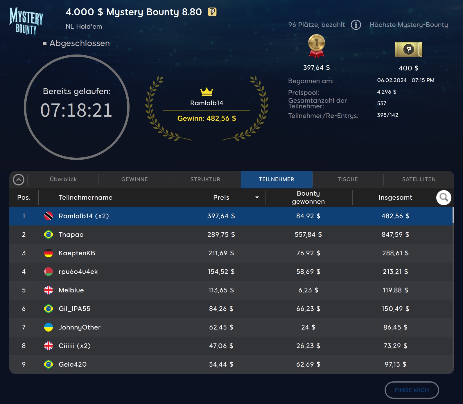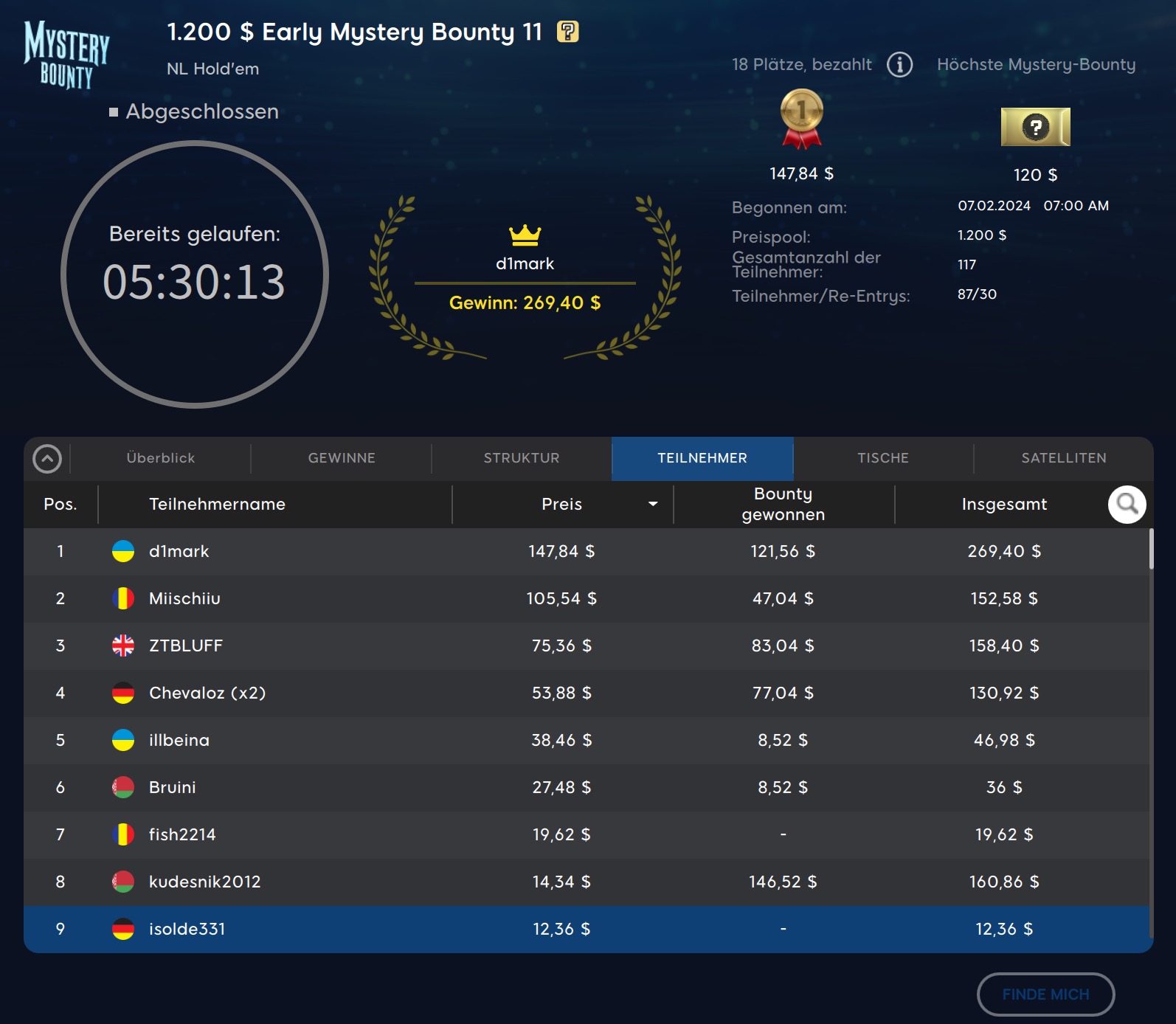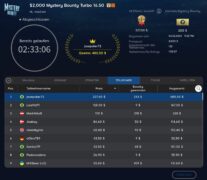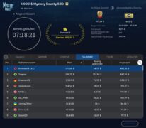 In weiteren Mystery Bounty Turnieren gab es folgend D-A-CH Final Table Cashes: „KaeptenKB“ ($288) als 3. von 537 im $4.000 Mystery Bounty 8,80, „oObis789“ ($52) als 6. von 132 im $2.000 Mystery Bounty Turbo 16,50, „Chevalou“ ($130) und „isolde331“ ($12) als 4. und 9. von 117 im $1.200 Early Mystery Bounty 11.