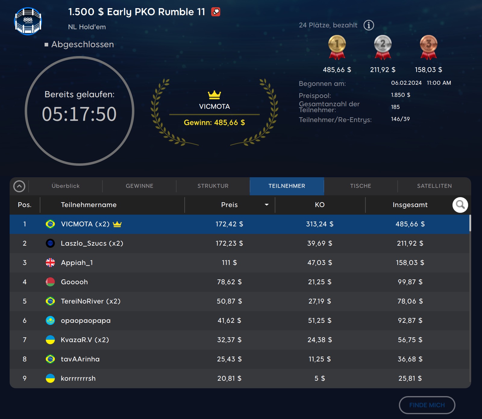 Weitere D-A-CH FT-Finishes aus den regulären Rumble Turnieren: „valorants“ ($177) als 4. von 103 im $1.500 PKP Rumble 6-Max 22, „Hexe007“ ($618) als 2. von 306 beim Sieg von „DelPieroooo“ ($933) und Platz 7 von „Thaddeus29“ ($112), „KellerA“ ($362) und „VirtualTopps“ ($75) als 2. und 6. von 53 im $2.000 PKO Rumble 55, „midein“ ($432) und „KellerA“ ($139) als 3. und 7. im $5.000 PKO Rumble 109.