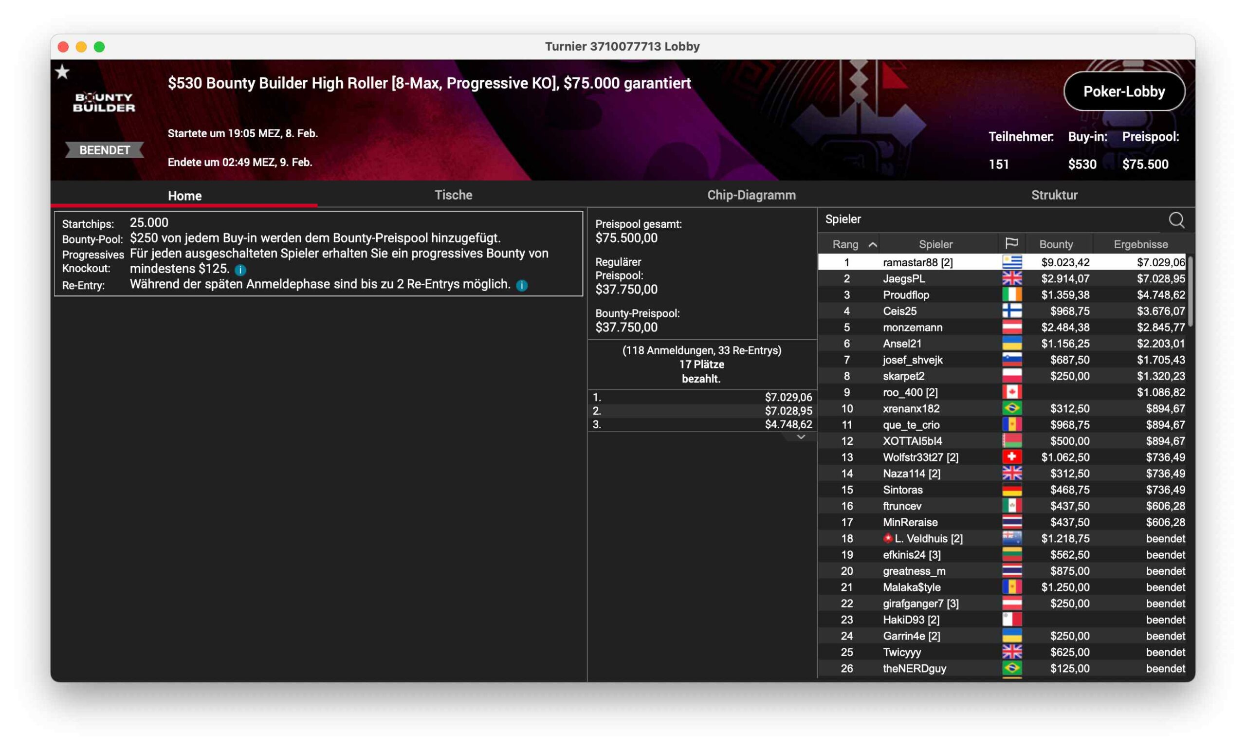Ramiro „ramastar88“ Petrone gewann das $530 Bounty Builder HR, bei dem 151 Entries und ein $75.500 Preispool zusammenkamen. Der Sieg brachte ihm $9.023 + $7.029 ein. Patrick „JaegsPL“ Lauber wurde Runner-Up für $2.914 + $7.028.