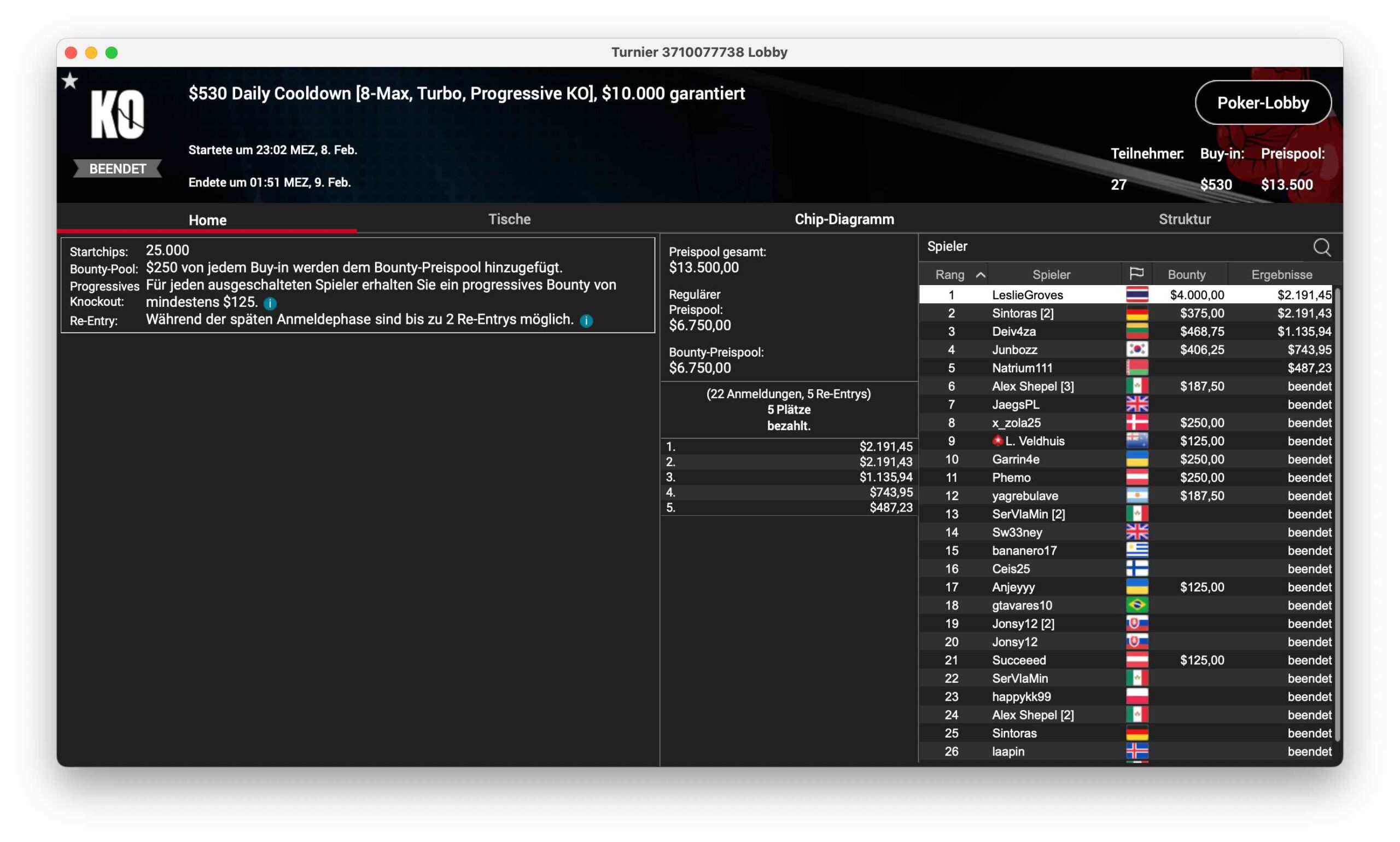 Es gab zumindest zwei mal Platz 2! Beim $530 Daily Cooldown gab es 27 Entries und $13.500 Preispool. „LeslieGroves“ holte den Sieg für $4.000 + $2.191, „Sintoras“ wurde Runner-Up für $375 + $2.191.