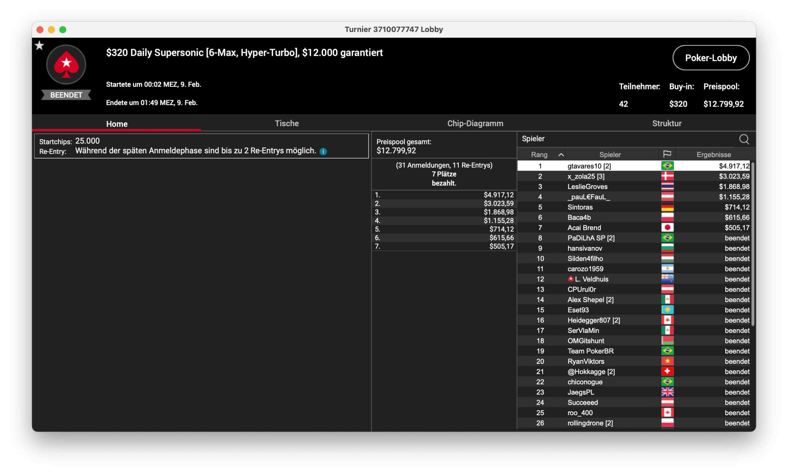 Das $320 Daily Supersonic ging an Gabriel „gtavares10“ Tavares. 42 Entries hatte das Turnier, ein $12.799 Preispool kam dadurch zustande. Der Sieg brachte ihm $4.917 ein.
