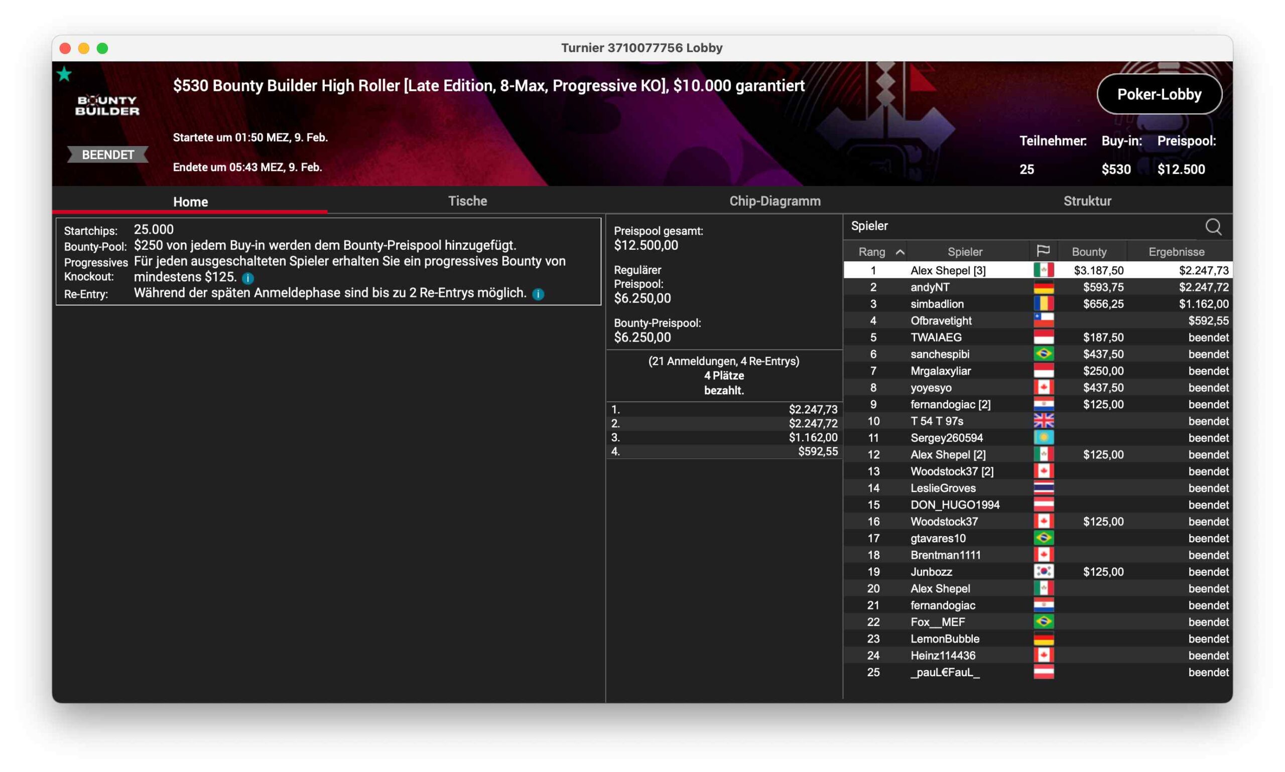 Das $530 Bounty Builder HR hatte 25 Entries und $12.500 Preispool. „Alex Shepel“ aus Italien gewann für $3.187 + $2.247, der deutsche Spieler „andyNT“ wurde Zweiter für $593 + $2.247.