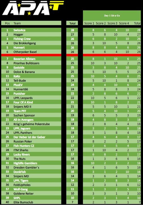 Am Freitag wurde das erste Set an 20 Sit ’n‘ Gos gespielt und es war wieder einmal erstaunlich wie eng die Teams am Ende zusammenlagen. Gerade einmal 10 Punkte trennten nach Tag 1 die Plätze 1 und 24. Es führt das Team „Swiss4ce“ (Daniela Locher, Benjamin Winiger, Stephan Horvath, Tatjana Kraska), vor „Hogger“ („Karottentotte“, „Vollbartvolker“, „Eriksen“, „Sp4tz“), der „Fishing-Crew“ („saxony“, Matthias Farkas, Sven Malzer, Sebastian Fleischmann), der „Brokkoligang“ („BlackMamba“, „Mitchi“, „Janina“, „Supermama“), „Hunnert“ („Carlo“, „TrompetenFL“, „Marcake“, „Jütte“) und „Otherpoker Basel“ (Mirko Wisselaar, Yvonne Savary Taveras, Antonio Spitaleri, „Ischi“). Das einzige Team, das nach Runde 1 etwas abgeschlagen auf dem letzten Platz liegt, ist der „Elite Bumsclub“.