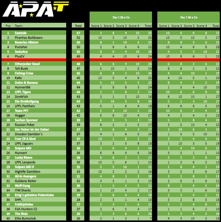 Danach kommen die Bavarian Allstars, das Team Punisher und Swiss4ce mit jeweils 50 Punkten – doch die vorderen Ränge des MTTs stehen noch aus – und auf den Sieger hier warten alleine 50 Punkte!