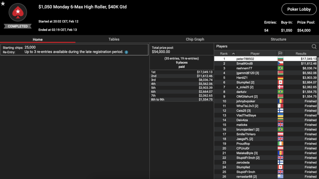 Des weiteren gab es noch das $1.050 Monday 6-Max High Roller mit einer $40k Garantie. 39 Spieler wagten sich hier ins Wasser und tätigten außerdem 19 Re-entries. Dies schuf einen Preispool von $54k und der gefährlichste Shark war letztendlich ‚peter788502‚ aus Bulgarien. Dieser nahm $17.049 mit nach Hause.