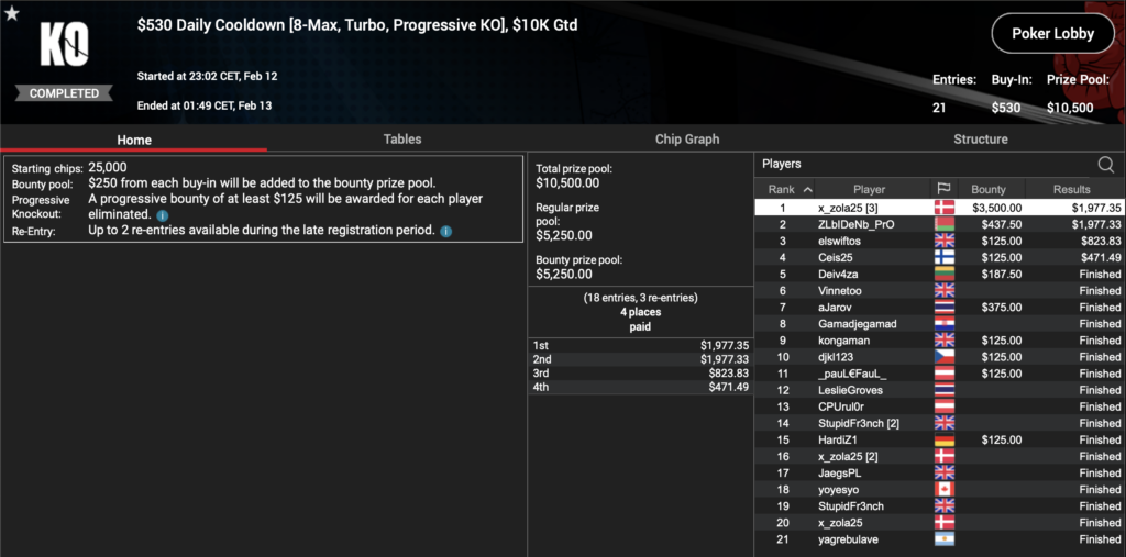 Und schlussendlich hatten wir das $530 Daily Cooldown High Roller ($10k GTD). Hier bezahlten 18 Spieler das Buy-in und tätigten außerdem noch drei Re-entries, was einen Preispool von $10.500 ergab und somit die Garantie knapp übertraf. Als Gewinner konnte sich ‚x_zola25′ aus Dänermark feiern lassen, welcher $1.977 für seinen Sieg und weitere $3.500 an Bounties erhielt erhielt.