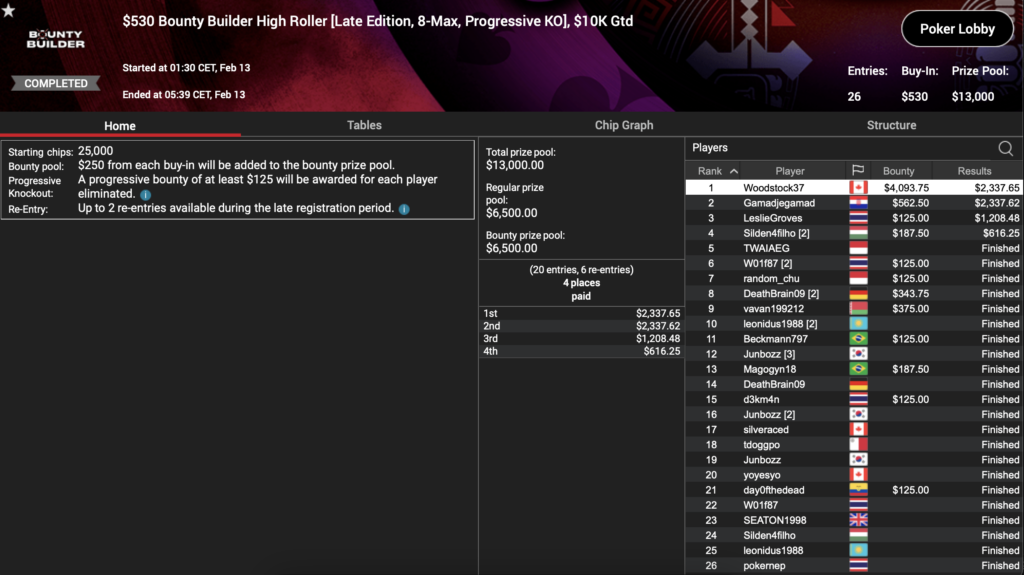 In der Late Edition dieses Turniers ging es mit 26 Entries etwas ruhiger zu. Die Garantie lag bei $10k und der Preispool stieg letztendlich auf $13k. Den größten Anteil davon schnappte sich der Kanadier ‚Woodstock37‚, der $2.337 erhielt und zusätzlich $4.093 an Bounties.
