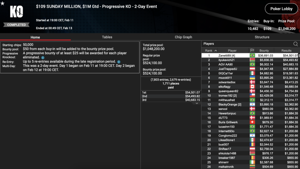 Wie es der Name verspricht, begann das Sunday Million Turnier am Sonntag und hatte ein $109 Buy-in mit einer $1 Million Garantie. Ganze 10.482 nahmen an dem Event Teil und das Turnier wurde bei 84 Spielern pausiert. Diese kehrten gestern an die Tische zurück und letztendlich war es ‚Zanetti89‚ aus Brasilien, der das Turnier und den $54.501 Top-Preis plus $36.691 an Bounties mit nach Hause nehmen konnte. Die beste DACH-Platzierung kam durch „JustTrappedU“ aus Österreich auf Platz vier für $27.884 plus $4.947 an Bounties