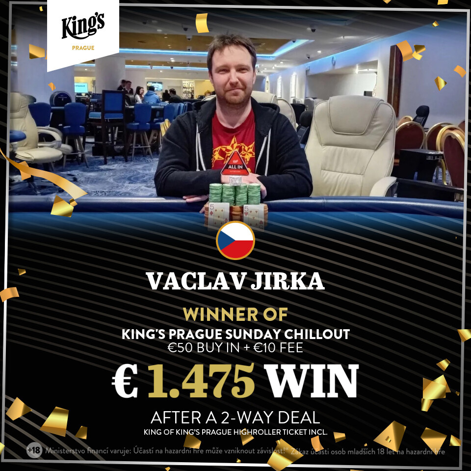 Im King’s Casino Prag wurde gestern auch gepokert. Dort gab es das €60 King’s Prague Sunday Chillout mit einer €5k Garantie und zwei King of King’s Tickets im Wert von €500 inklusive. Die Garantie wurde knapp verpasst, denn wir hatten nur 94 Entries (54 + 40 Re-entries). Elf Spieler teilten den Preispool unter sich auf und nach einem Heads-up Deal war es der Tscheche Vaclav Jirka, der den €1.475 Top-Preis einstreichen konnte.