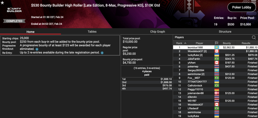 Und zum Abschluss hatten wir das $530 Daily Cooldown ($10k GTD). Hier gab es insgesamt 18 Entries und somit wurde auch hier die Garantie nicht erreicht. Der Gewinner ‚luckyfluke‚ aus der Ukraine strich für seine Leistung $2.071 plus $3.000 an Bounties ein.