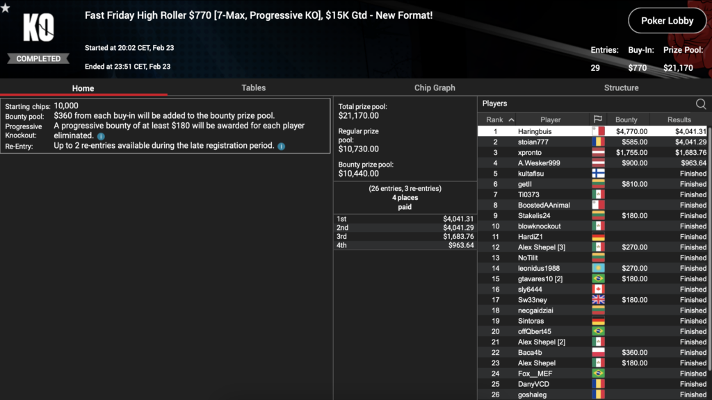 Des weiteren gab es noch das $770 Fast Friday High Roller ($15k GTD). Hier fanden sich 26 Spieler zusammen und bezahlten außerdem für drei Re-entries. Dies ergab einen Preispool von $21.170 und einen Top Preis von $4.041, den sich ‚Haringbuis‚ aus Malta plus $4.770 ergattern konnte.
