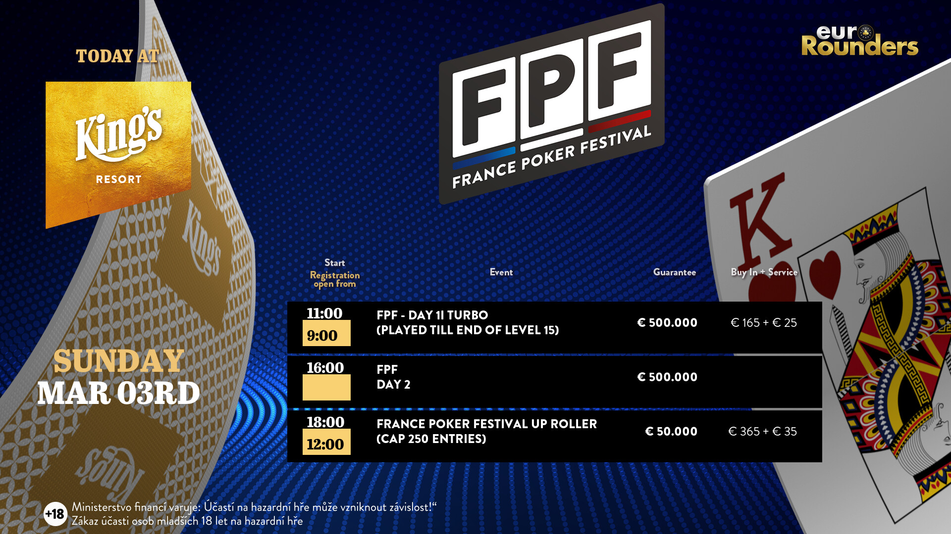 Neben dem Main Event des France Poker Festival (FPF) powered by EuroRounders im King’s Resort Rozvadov gab es drei Side-Events und in der tschechischen Hauptstadt Prag wurde ebenfalls ein Turnier gespielt.