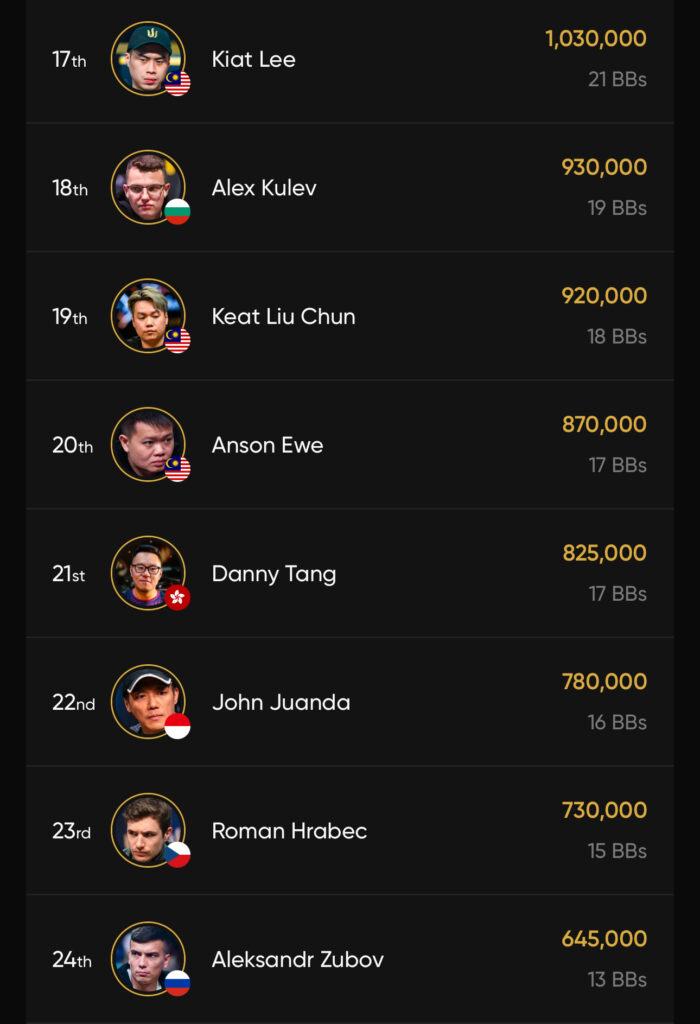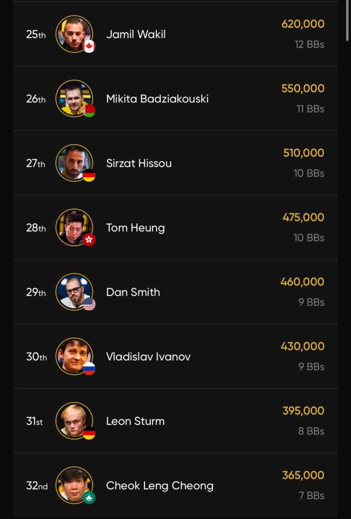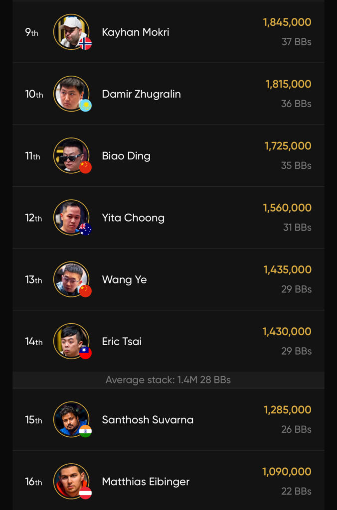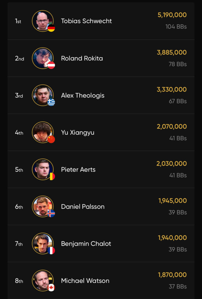 Die beiden letzteren sind momentan für Tag 2 in den Chipcounts ganz oben mit dabei. Rokita hat 3.885.000 Chips (78BB) und Schwecht ist der Chipleader mit 5.190.000 (104BB). Insgesamt gab es 225 Entries und somit einen $4.500.000 Preispool für dieses Event und nun kämpfen die letzten 32 Spieler morgen ab 5:00 Uhr deutscher Zeit um den Sieg und einen Top-Preis von $904.000.