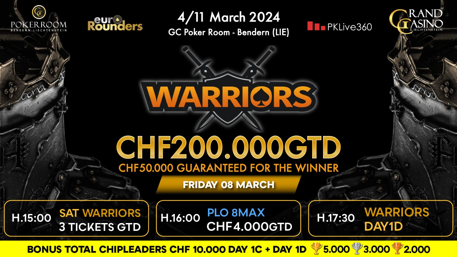 Beim Main Event des WARRIORS-Pokerfestivals powered by euroRounders im Grand Casino Liechtenstein wurde am gestrigen Donnerstag den Tag 1C ausgespielt.