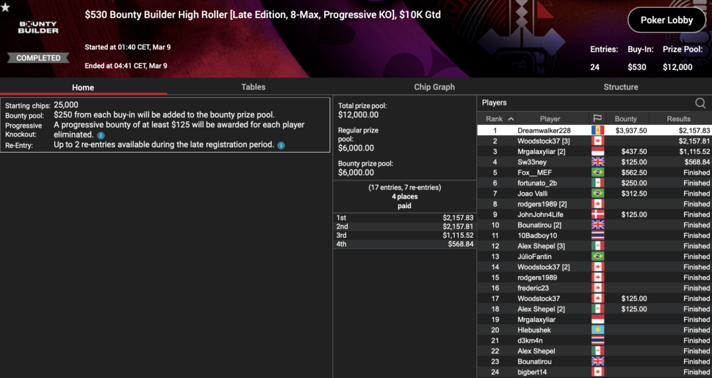 In der Late Edition dieses Turniers wurde eine $10.000 Garantie geboten. Auch diese konnte erfüllt werden, denn 24 Entries bildeten einen $12k Preispool. Der Gewinner kam aus Andorra. ‚Dreamwalker228‚ erhielt $2.157 plus $3.937 an Bounties für seinen Sieg.