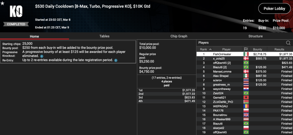 Und zu guter Letzt gab es das $530 Daily Cooldown, das seine $10k-Garantie knapp verfehlte. 19 Spieler meldeten sich für dieses Turnier an und vier davon wurden bezahlt. ‚FishOnHeater‚ aus Mexiko konnte sich hier als Sieger etablieren und $1.977 plus $2.718 an Bounties kassieren