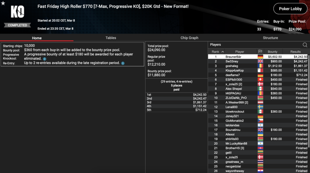 Im größten Turnier des Tages gab es einen DACH-Erfolg. Das $770 Fast Friday High Roller ($20k GTD) konnte 33 Entries verzeichnen und hatte somit einen Preispool von $24.090. Ganz oben auf dem Siegertreppchen fanden wir letztendlich den deutschen Spieler ‚BraunerBär‚. Dieser konnte $4.242 plus $5.602 an Bounties einstreichen.