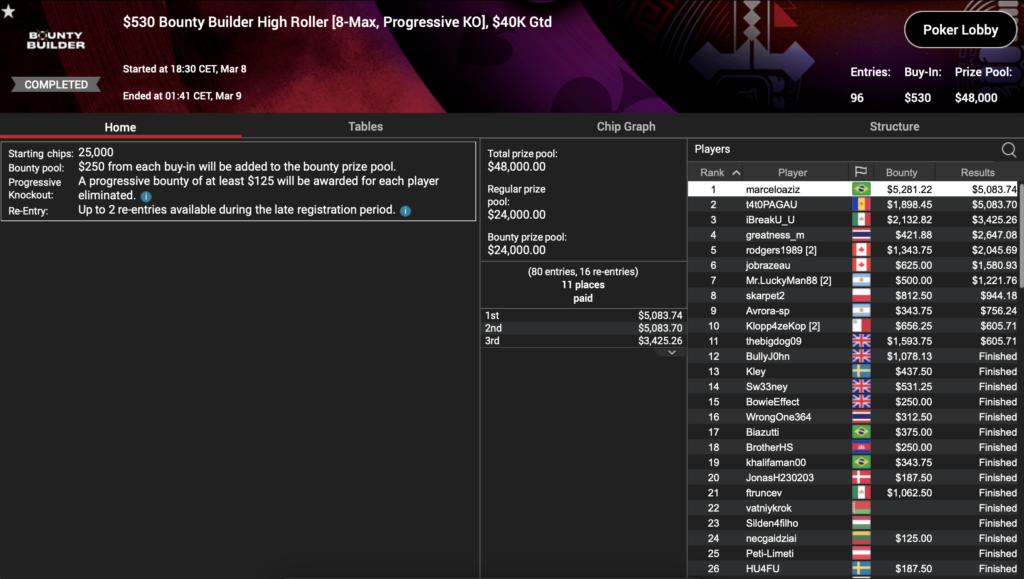 Fangen wir an mit den beiden $530 Bounty Builder High Roller-Turnieren. Das erste hatte eine $40k Garantie und 96 Entries schufen am Ende einen Preispool von $48k. Der Sieger ‚marceloaziz‚ kam aus Brasilien und konnte $5.083 plus $5.281 an Bounties mit nach Hause nehmen.