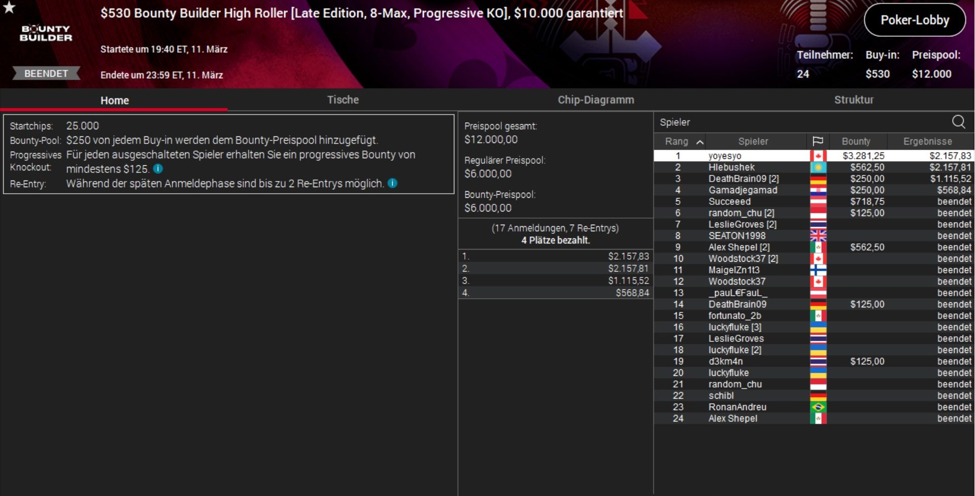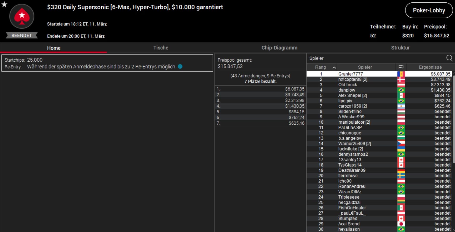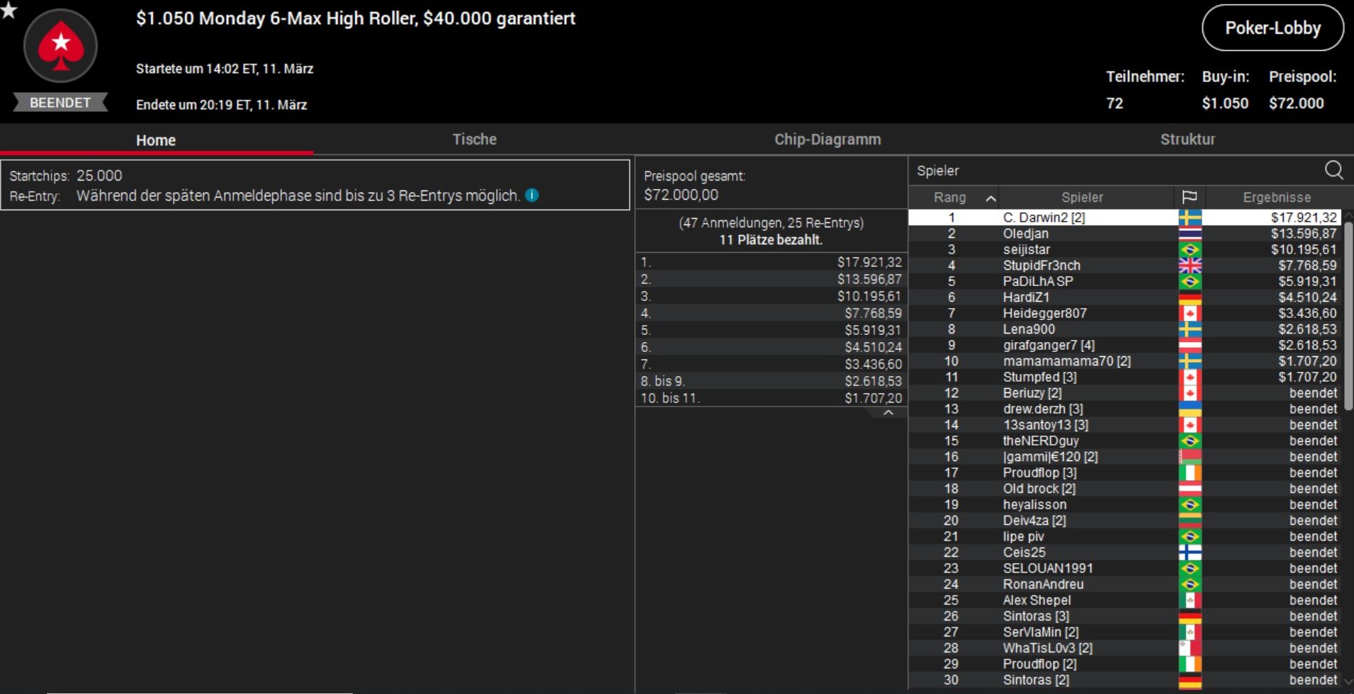 Den Sieg beim teuersten Turnier des Tages sicherte sich derweil die schwedische Online-Legende Simon „C. Darwin2“ Mattsson, der sämtliche 71 Konkurrenten hinter sich ließ und über $17.000 abräumte.