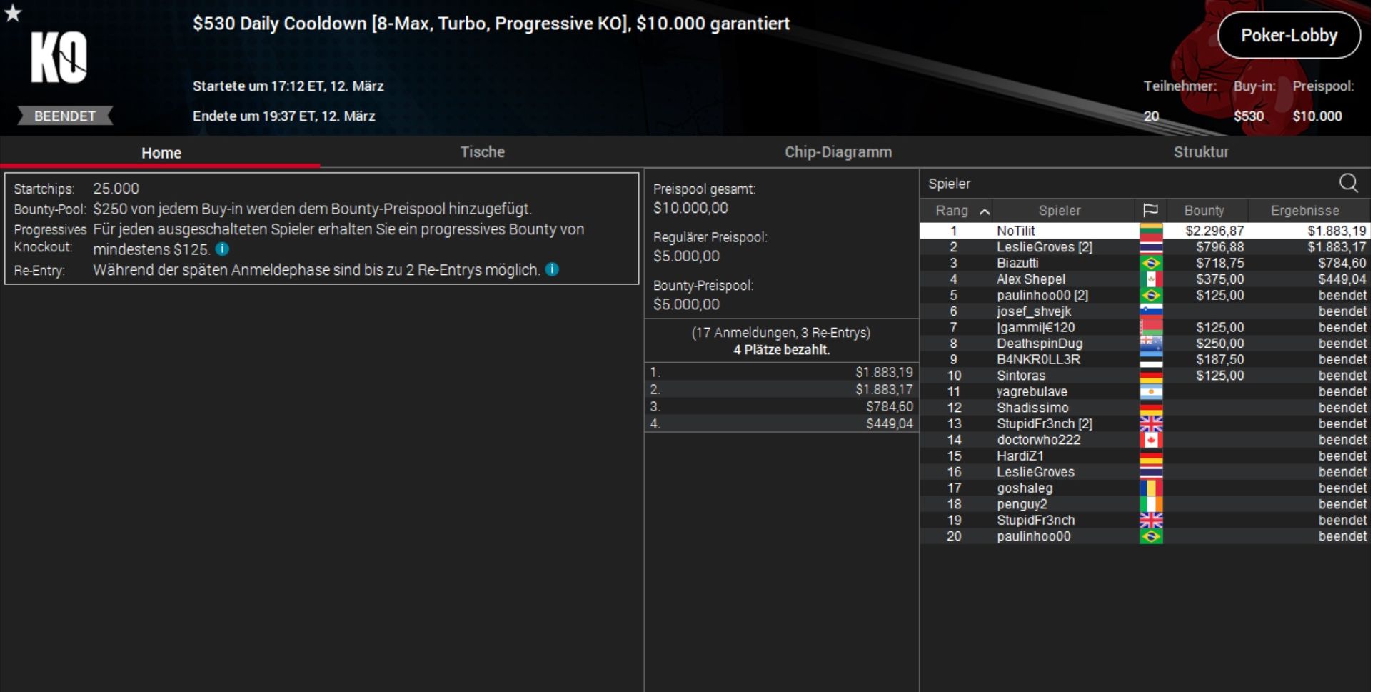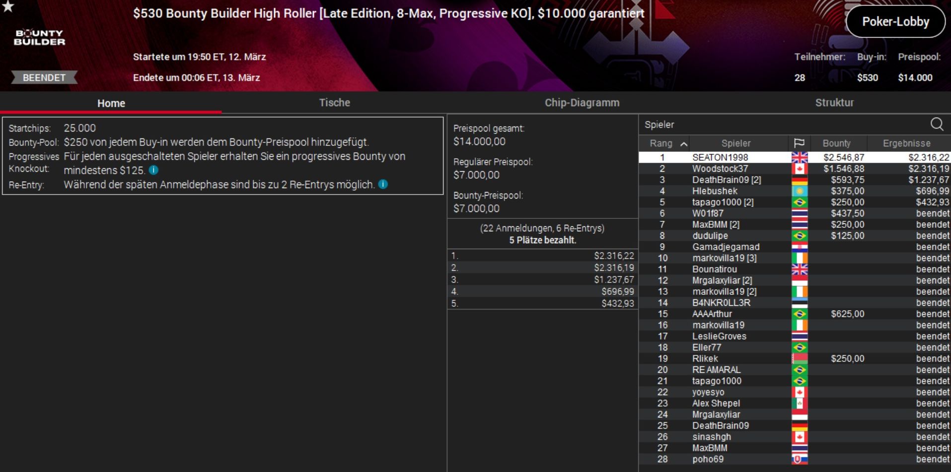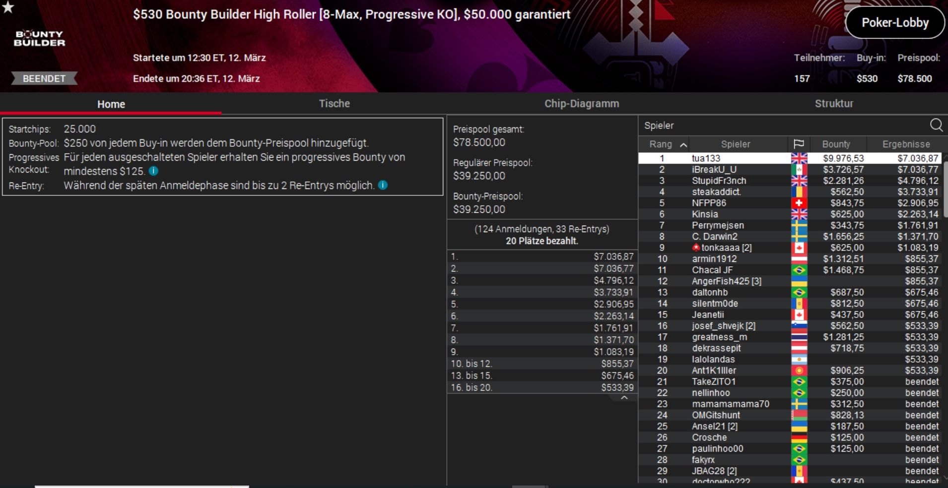 Zu später Stunde gab es dann noch ein Top-Ergebnis beim $530 Bounty Builder Late Edition. Hier belegte „DeathBrain09“ aus Deutschland den dritten Platz und nahm gut $1.800 mit.