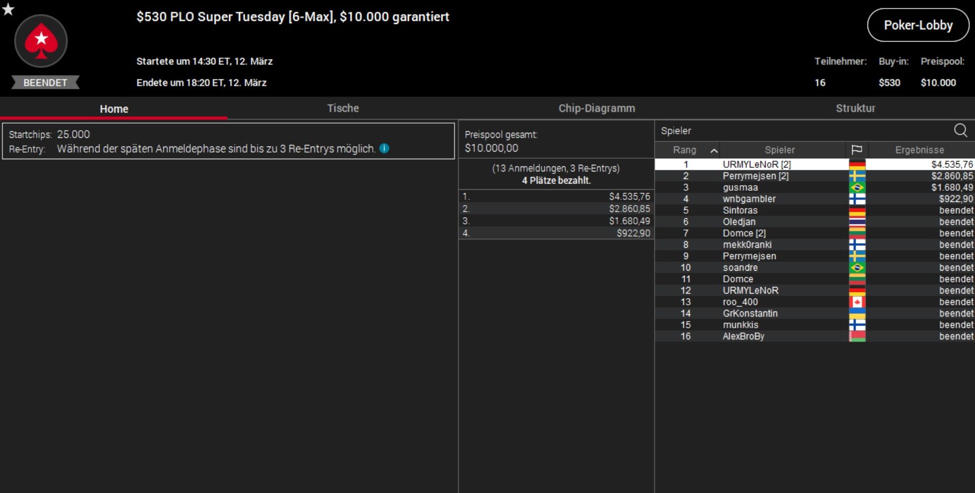 Einen „echten“ Sieg holte PLO-Spezialist „URMYLeNoR“ aus Deutschland beim $530 PLO Super Tuesday. Er bezwang 15 Konkurrenten und kassierte gut $4.500 Preisgeld.