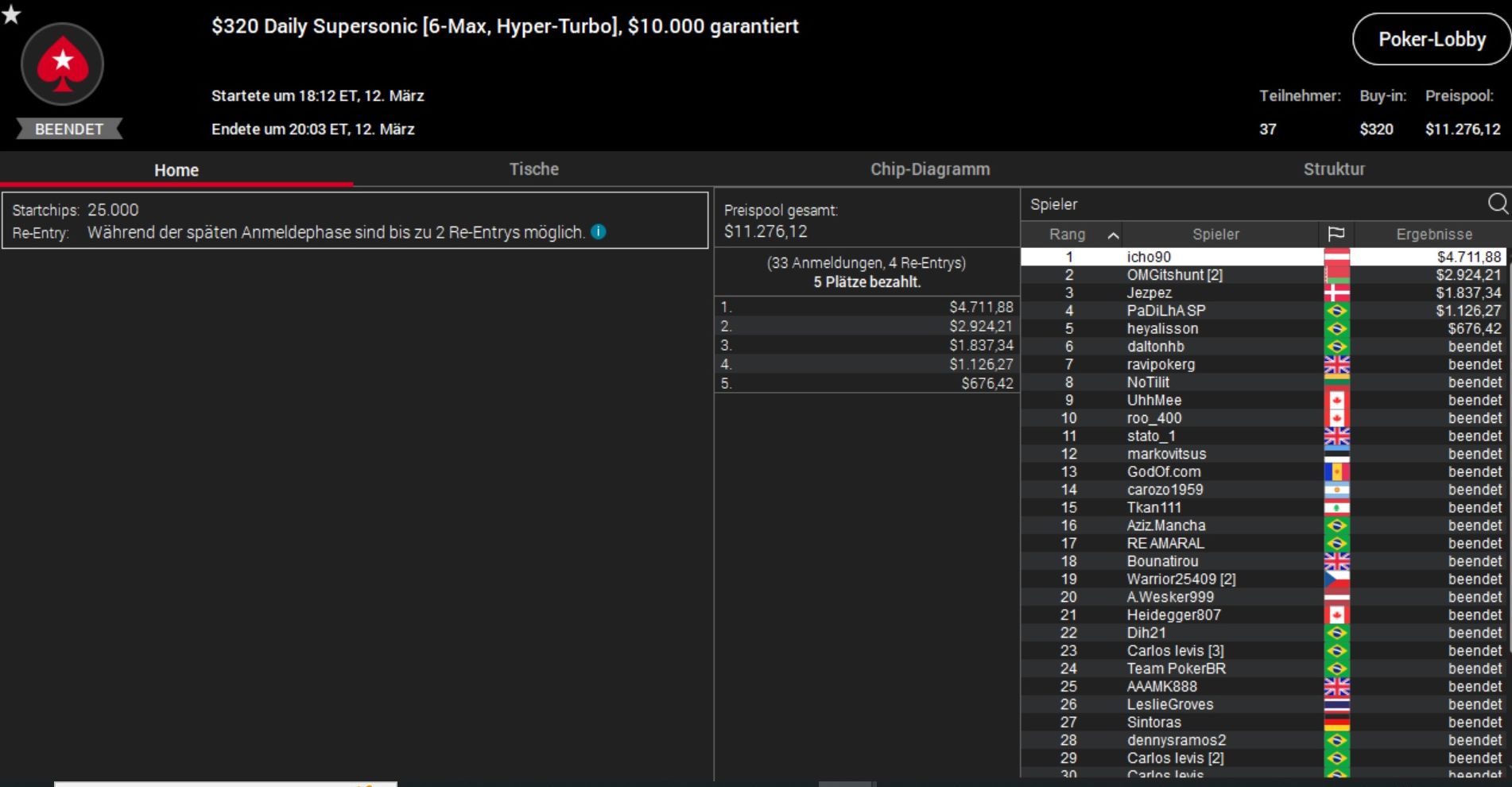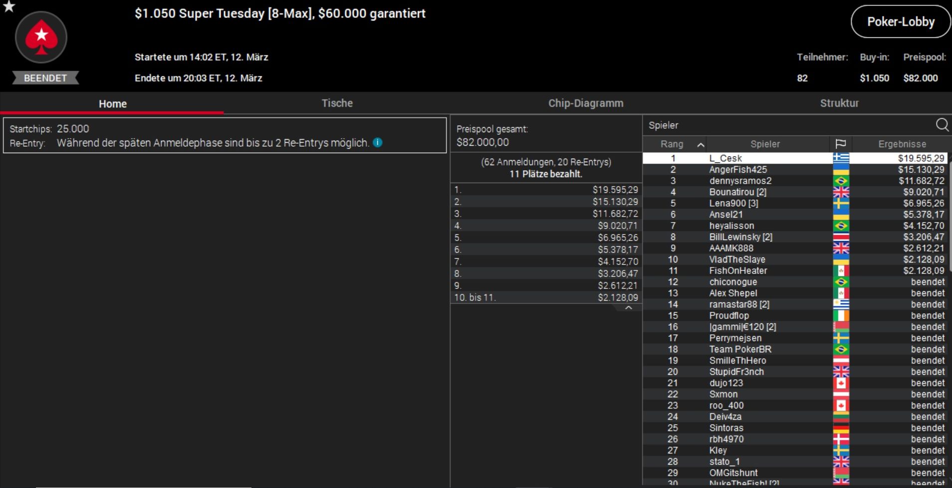 Starker Vierter wurde beim teuersten Turnier des Tages, dem $1.050 Super Tuesday, Dominik „Bounatirou“ Nitsche. Das brachte ihm gut $9.000 Preisgeld ein, Sieger „L_Cesk“ aus Griechenland räumte über $19.000 ab.