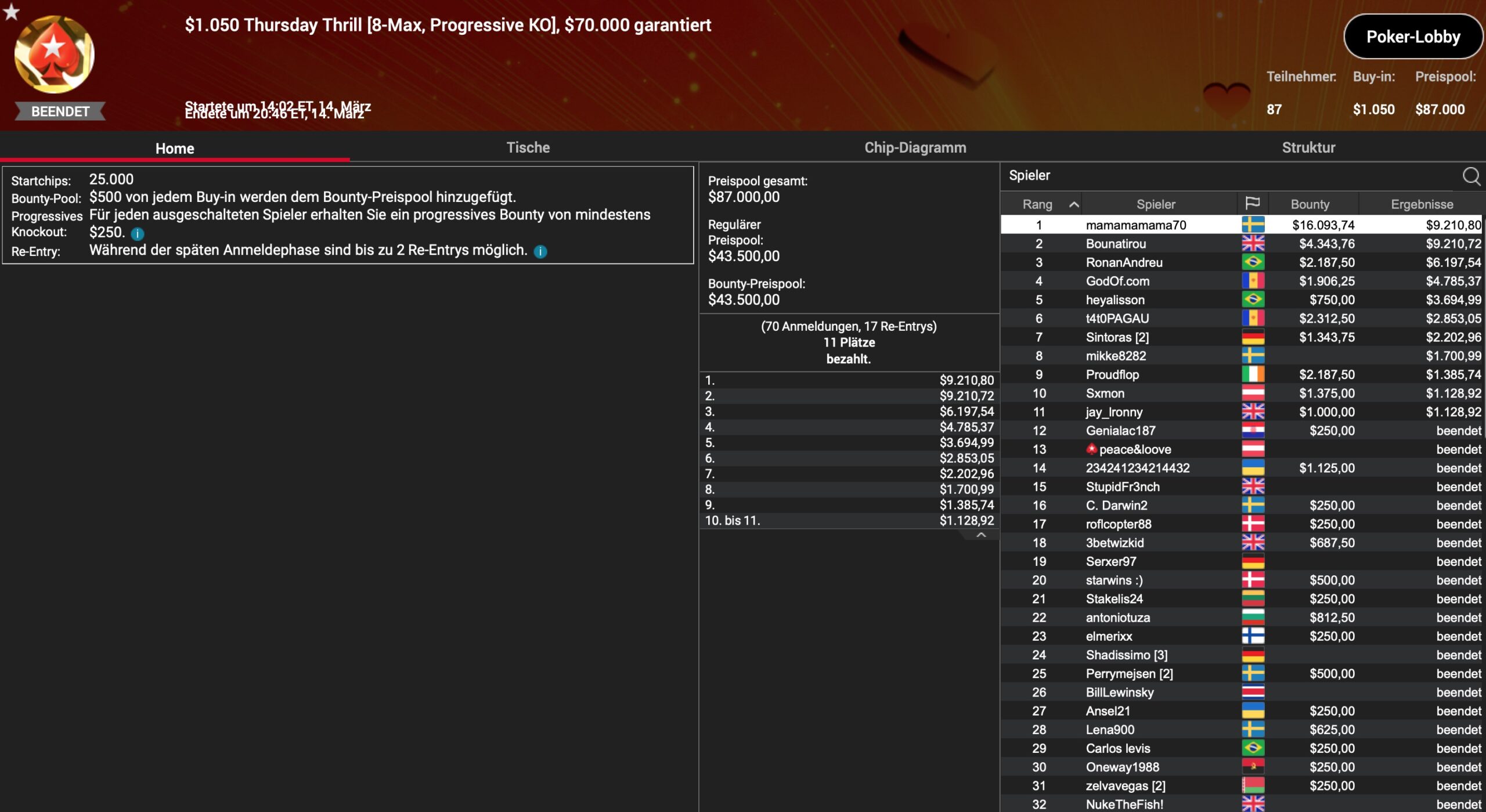 70 Spieler und 17 Re-Entries sorgten im Aushängeturnier des Donnerstags auf PokerStars für $87.000 im Preispool. Auf der Soft Bubble schied der österreichische PokerStars Team Pro „peace&loove“ aus. Eine weiter Bubble-Platzierung ging ebenfalls an Österreich. Allerdings für das Final Table Bubble Aus von „Sxmon“ wenigstens noch mit $2.503 Schmerzensgeld entlohnt. Am Final Table bustete „Sintoras“ auf Platz 7, wofür er ein kombiniertes Payout von $3.545 erhielt. Als nach fast 7 Stunden Spielzeit die Entscheidung im Heads-Up fiel, war mit Dominik „Bounatirou“ Nitsche immer noch ein Deutscher am Tisch. Der Wahl-Ire musste allerdings „mamamamama70“ aus Schweden letztendlich den Vortritt lassen. Nichtsdestotrotz landeten mit dem Turnierende $13.554 in der Bankroll des Deutschen, während $25.304 nach Schweden gingen.