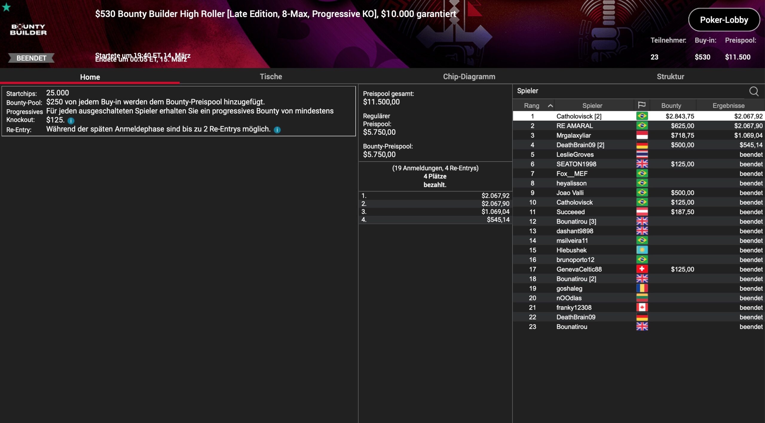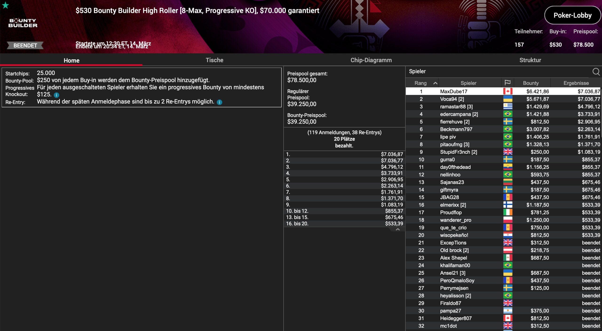 In der zur „normalen“ Zeit stattfindenden Ausgabe vom $530 Bounty Builder war es „MaxDube17“ aus Kanada, der nach 8 Stunden Spielzeit alle 156 Kontrahenten hinter sich ließ. Dafür würde er mit $13.458 Preisgeld belohnt.