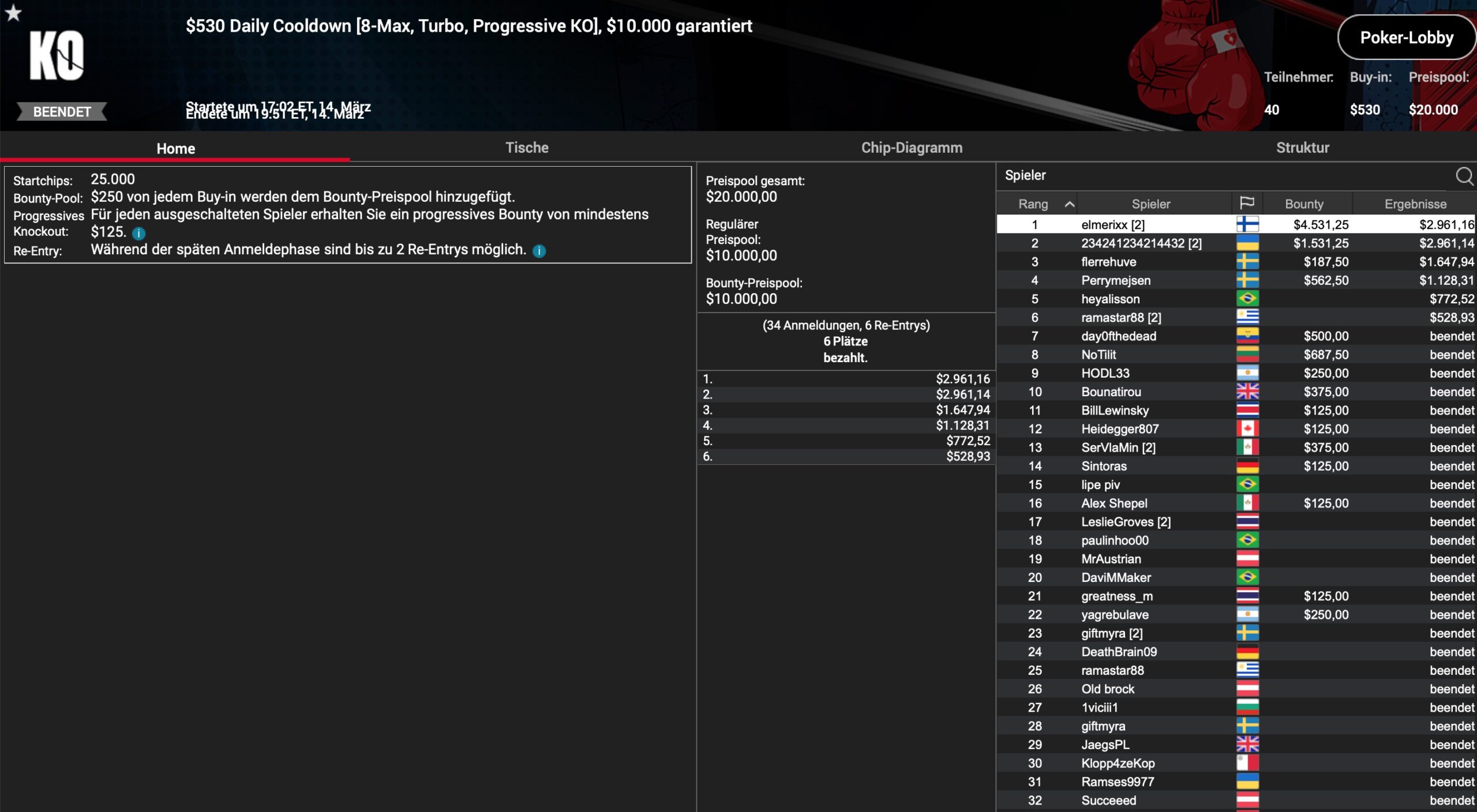 Der Sieger im $530 Daily Cooldown hieß „elmerixx“. Der Finne, der derzeit auf PokerStars richtig heiß läuft, gewann als Sieger nach 3 Stunden unter 40 (34+6) Teilnehmern, die eine Garantie-Punktlandung in dem $20k gtd. MTT hinlegten, insgesamt $7.492.