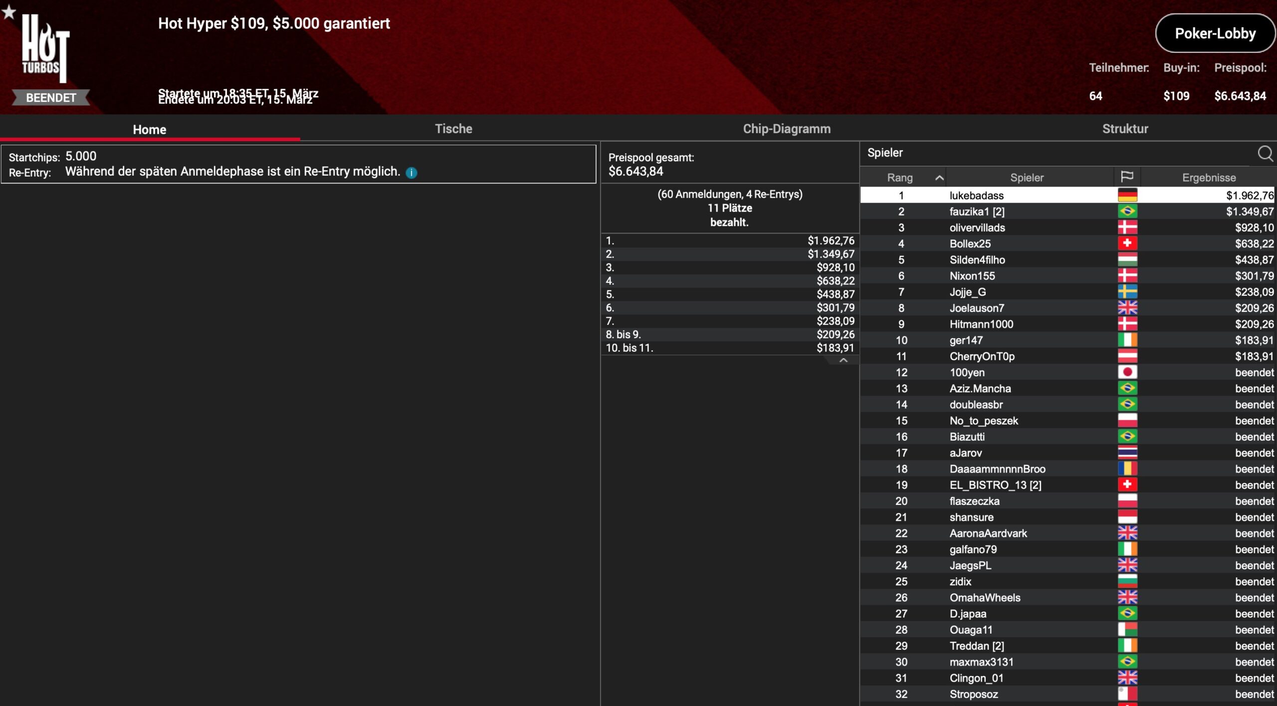 Ohne Bounties, dafür im typischen Badass-Stil gewann „lukebadass“ das Hot Hyper $109 Freezout. Nach nur 90 Minuten stand er als Gewinner unter 64 (60+4) Total Entries fest, was ihm $1.962 einbrachte.