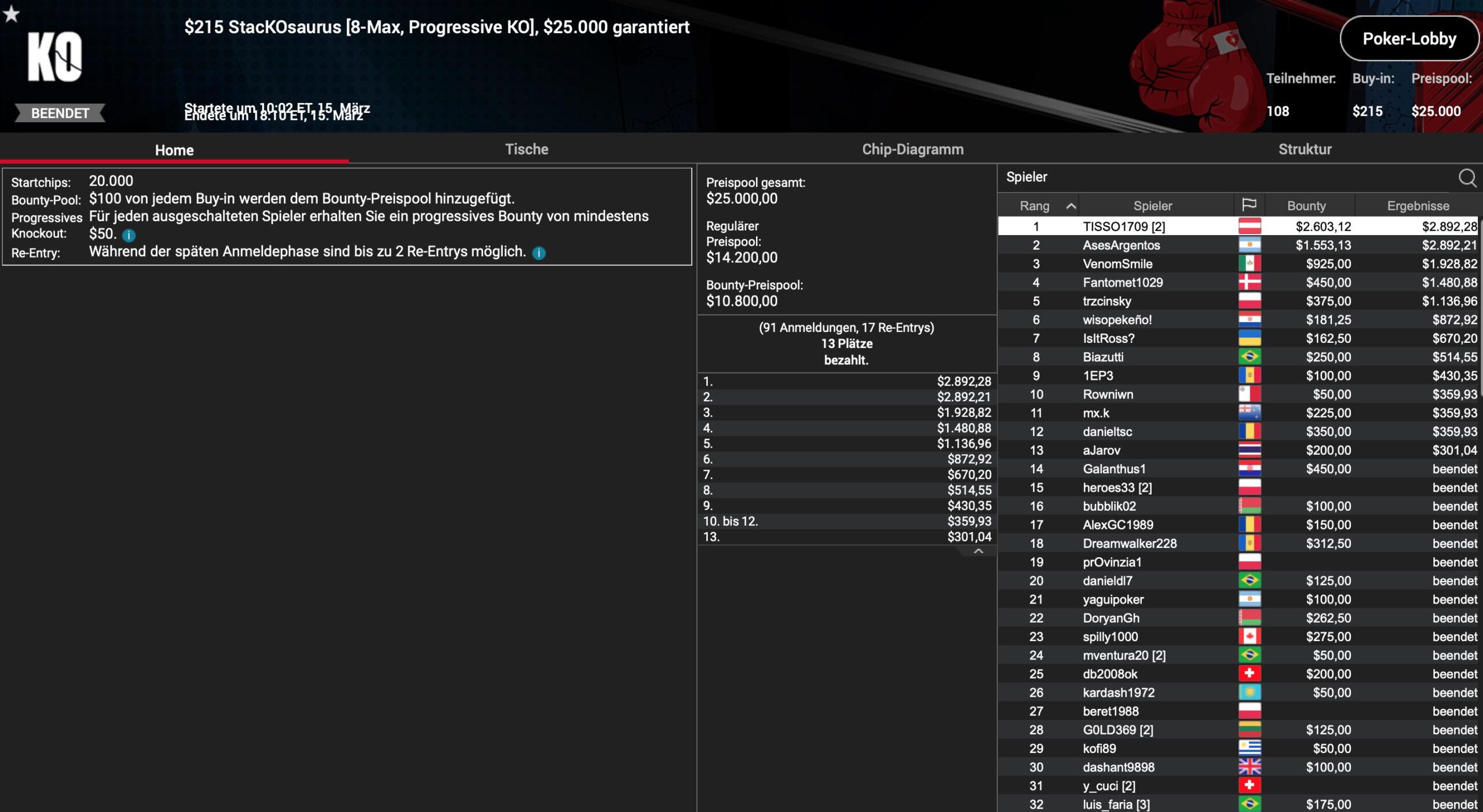 Patrick Lauber holte als „JaegsPL“ unter 43 (39+4) Total Entries nach 3,5 Stunden Spielzeit den Sieg im Bounty Builder $215. Aus dem kombinierten Payout von Bounties und Preisgeld flossen danach $2.470 in seine PokerStars Bankroll.