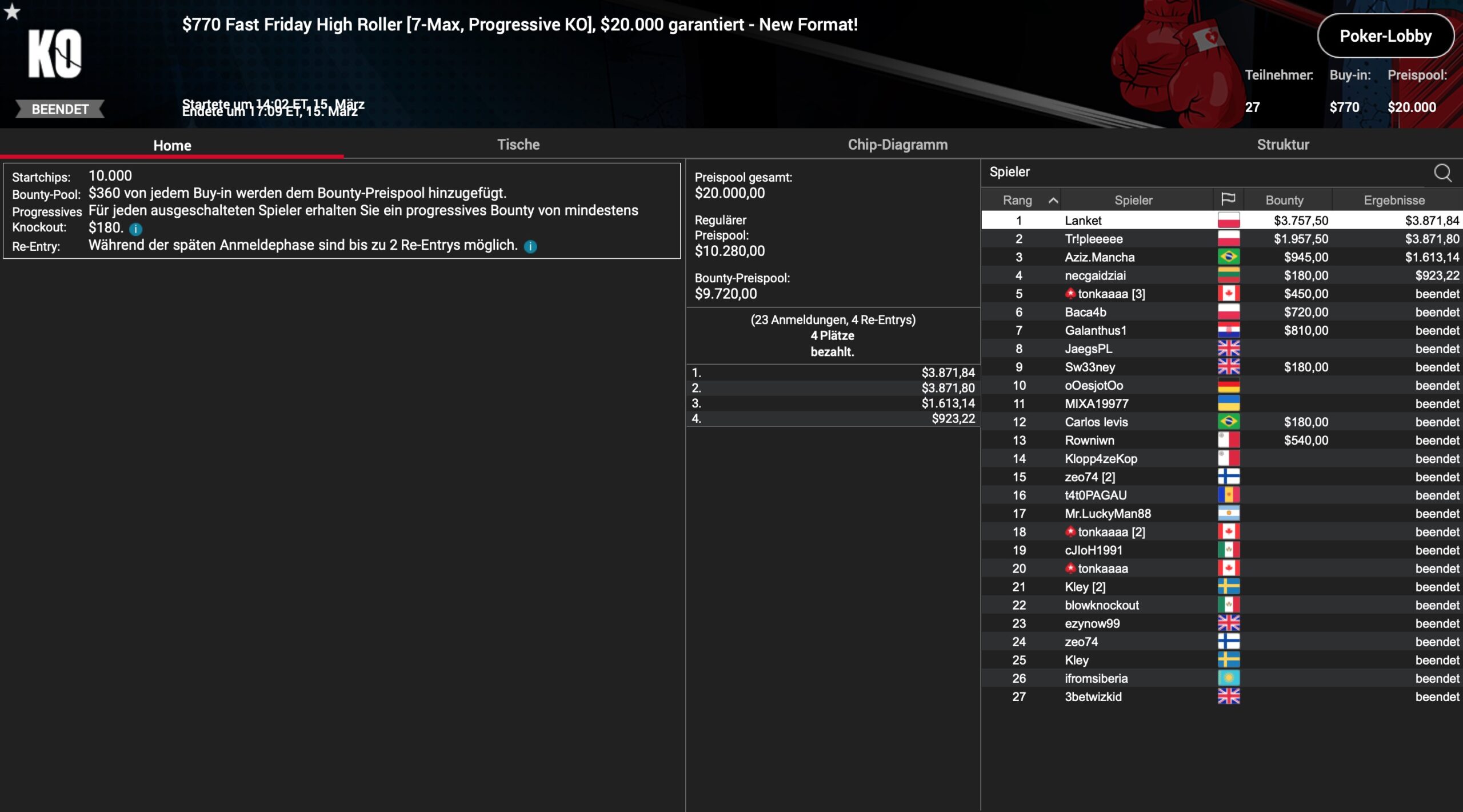 Im Signature MTT des Friday Grinds, dem $770 Fast Friday HR gingen 27 (23+4) Entries an den Start. Zuwenig um die $20k-Garantie zu knacken, so dass PokerStars ein Overlay von $1.100 noch in den Preispool packte. Gleich 3 Bullets nutzte der kanadische PokerStars Team Pro Parker „tonkaaaa“ Talbot. Da schmerzte es besonders genau auf der Bubble auszuscheiden. Einen Doppelsieg feierte die polnische Spielerfraktion. Runner-Up wurde „TrIpleeeee“ ($5.829), während der weißrussische Wahl-Pole „Lanket“ den Sieg und insgesamt $7.629 holte.