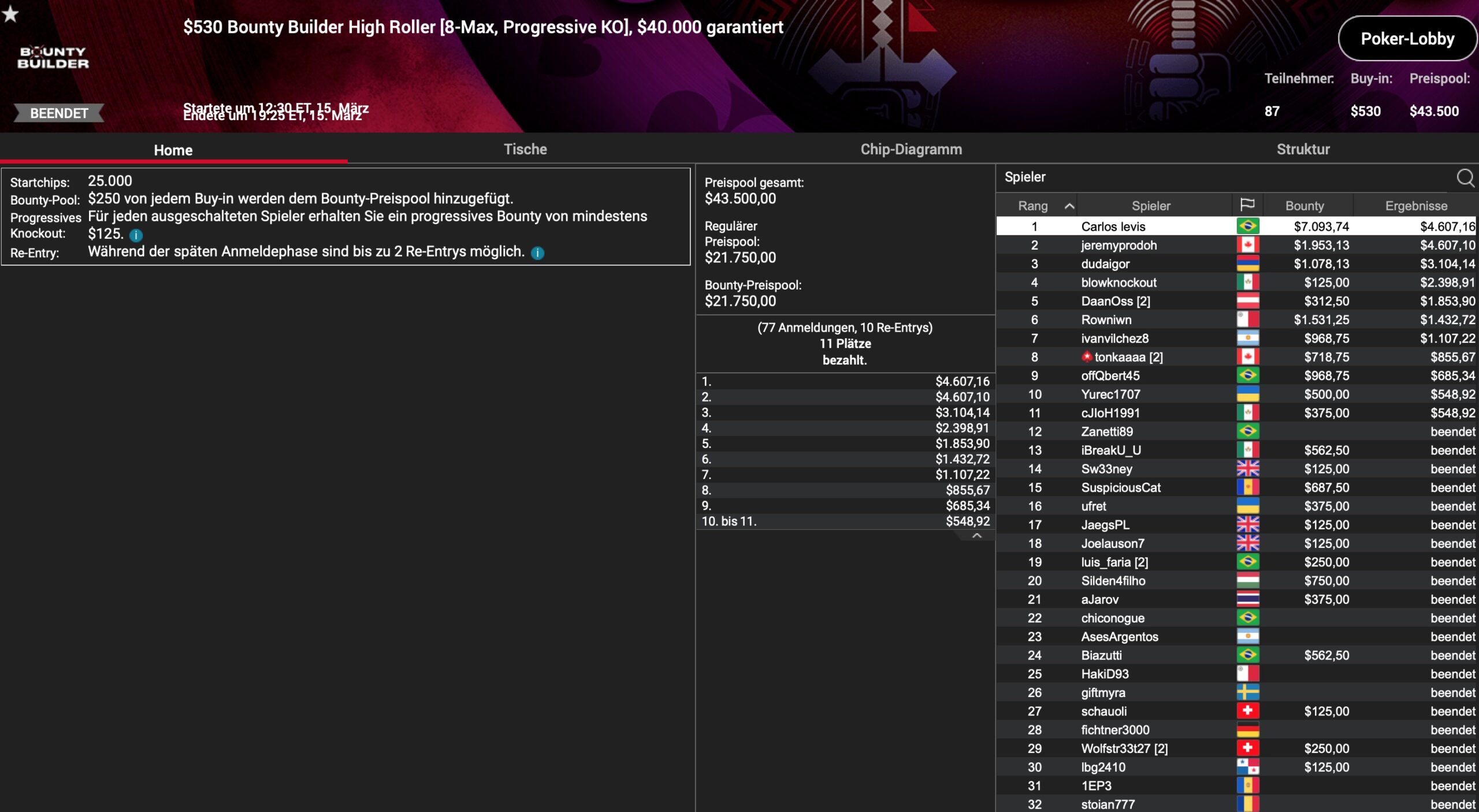 Im $530 Bounty Builder High Roller konnte PokerStars Team Pro „tonkaaaa“ seinen Bubble-Frust wettmachen (wenn auch nicht den finanziellen Verlust), indem er es mit dem zweiten Buullet als 8. an den Final Table schaffte. Hier fand sich auch der belgische Wahl-Österreicher Daan „DaanOss“ Mulders als 5. ($2.166) von insgesamt 87 (77+10) Teilnehmern wieder. Der Sieg und satte $11.700 aus dem $43.500 Preispool gingen nach 7 Stunden Spielzeit an „Carlos levis“ aus Brasilien.
