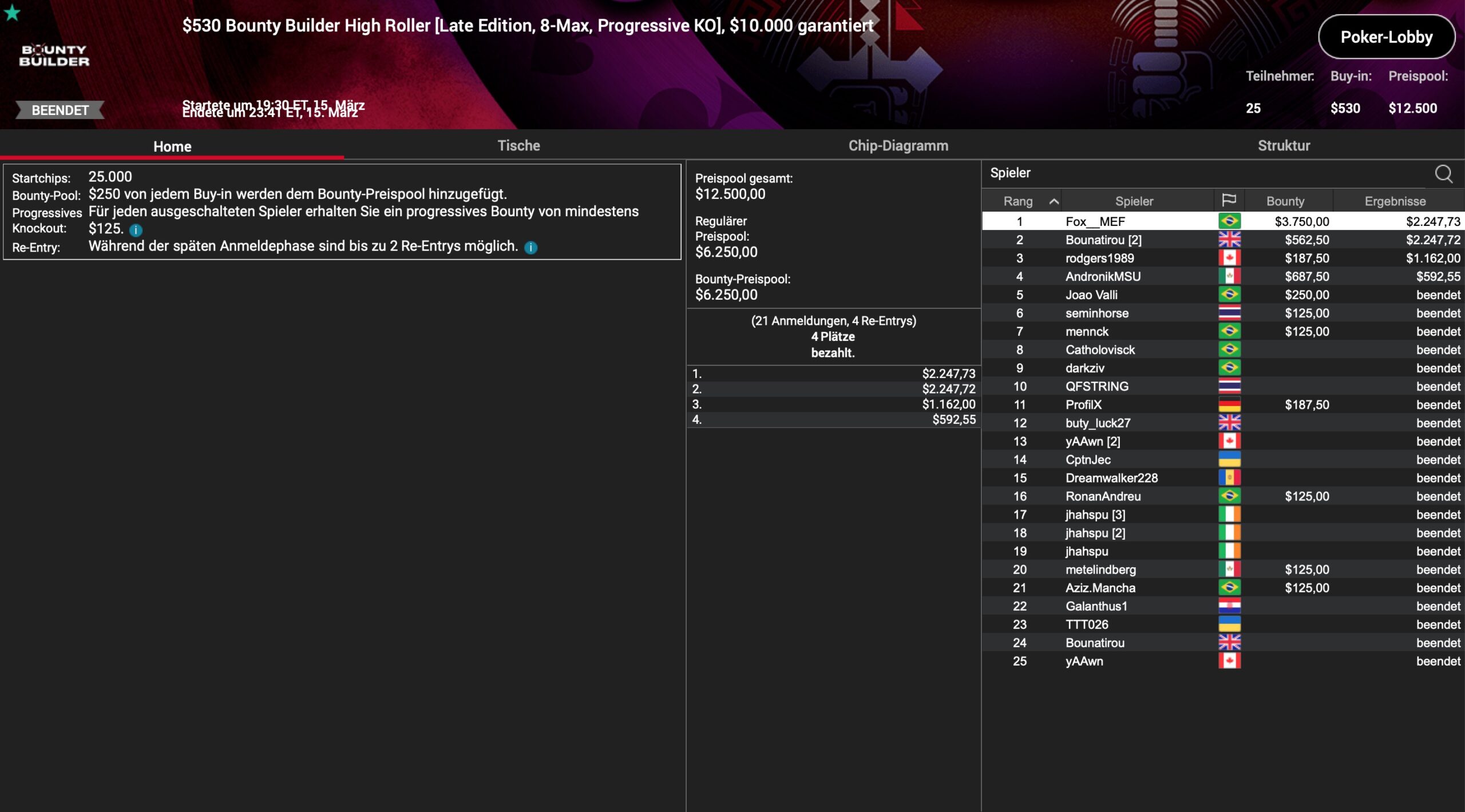 Die Late Edition des $530 Bounty Builder ist so etwas wie das Aushängeturnier von Dominik Nitsche. Unter dem Namen seines Gymnasiallehrers hält ist „Bounatirou“ oft der einzige Vertreter der D-A-CH-Community in dem frühmorgendlichen MTT. Auch am Freitag war er wieder am Start und beendete das Turnier nach etwas mehr als 4 Stunden Spielzeit auf dem Silberrang ($2.810). Die virtuelle Goldmedaille ging unter 25 (21+4) Teilnehmern zusammen mit $5.997 Siegprämie an „Fox__MEF“ aus Brasilien.
