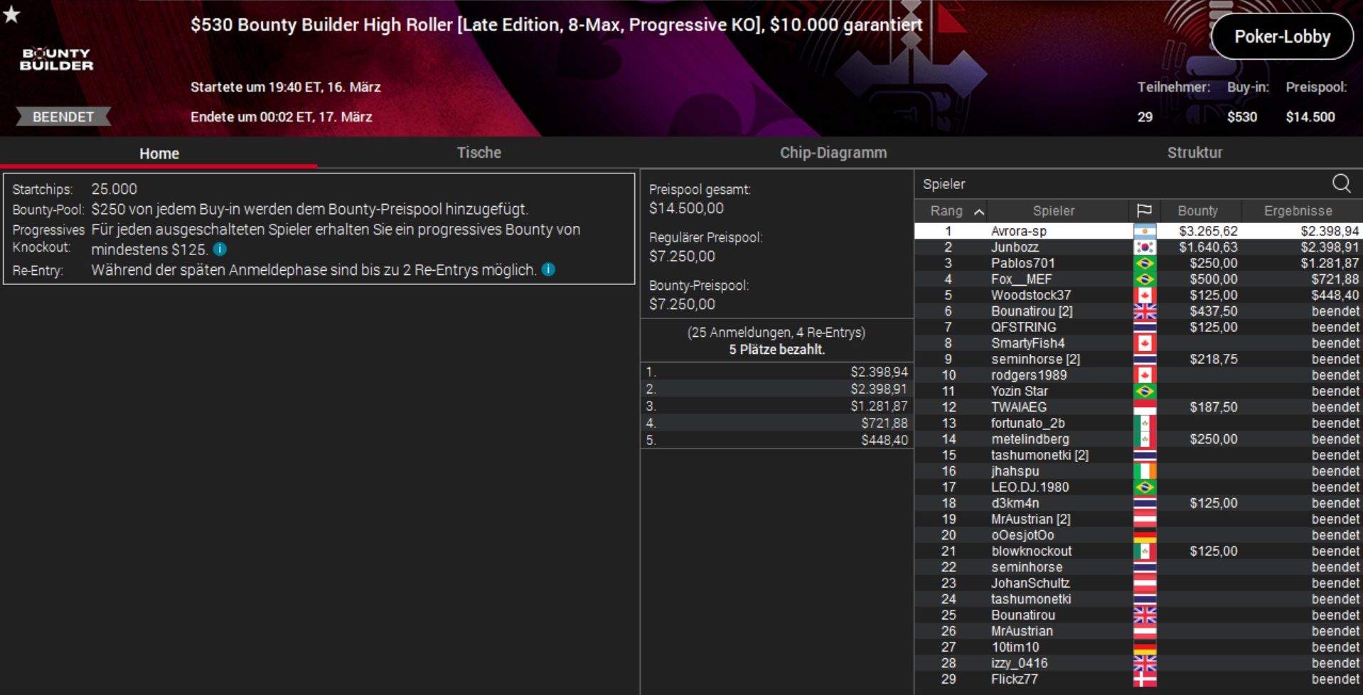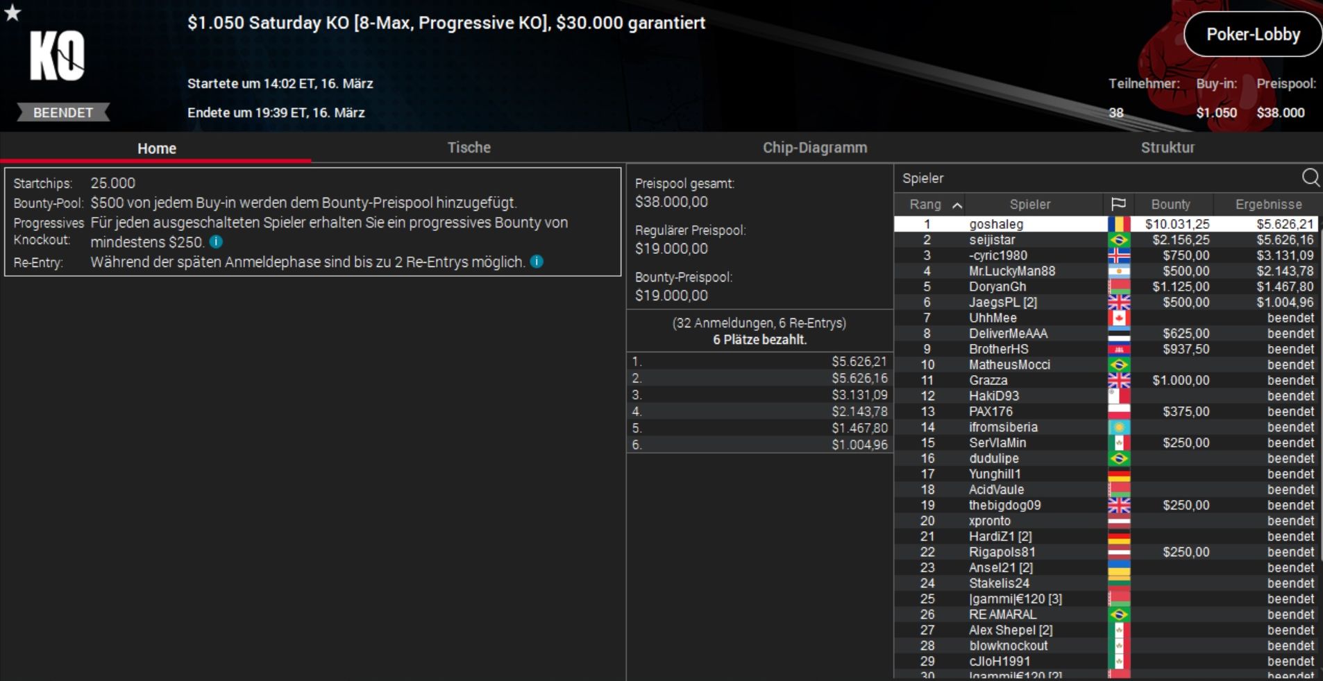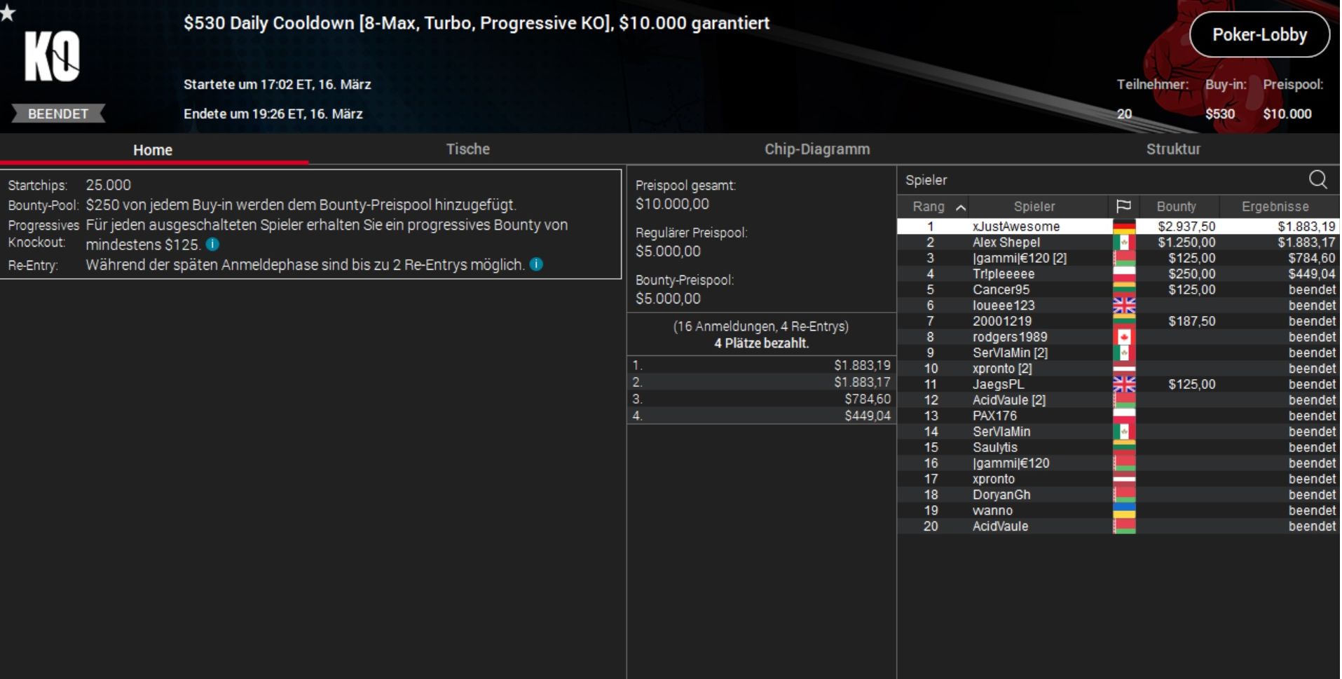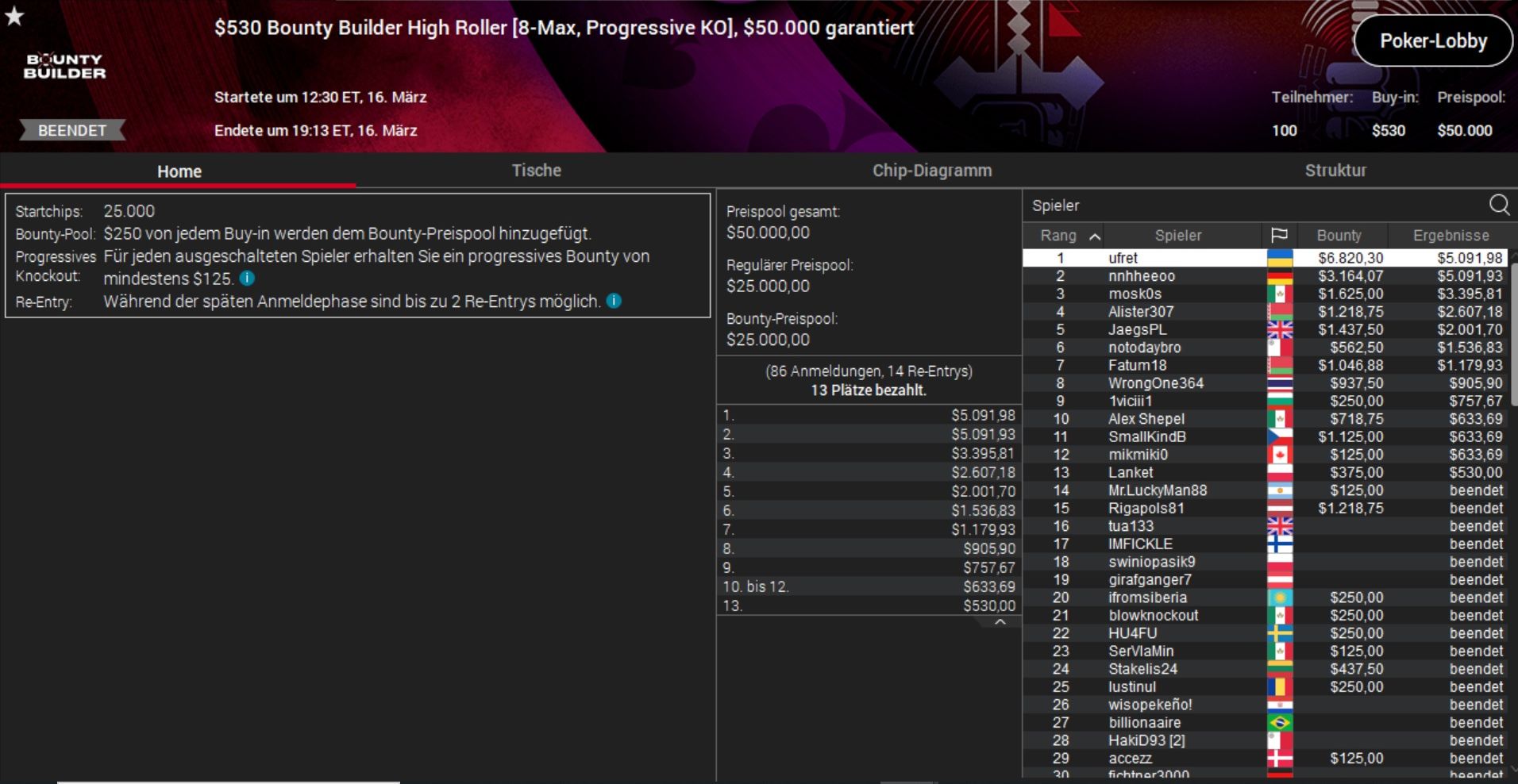 Größter Gewinner der DACH-Fraktion war aber nicht einer der beiden Sieger, sondern „nnhheeoo“ aus Deutschland, der beim $530 Bounty Builder als Runner-Up von genau 100 Entrys rund $8.200 kassierte.