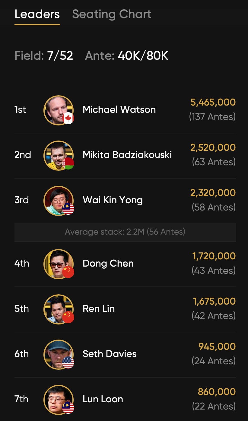 Beste Chance darauf hat der Kanadier Michael Watson, der in der Schlussphase von Tag 1 sowohl Richard Yong (Rang 10) als auch Tan Xuan (Rang 8) aus dem Turnier nahm. Seine volatile Spielweise als Big Stack zahlte sich aus. Er geht als Chipleader mit 5.465.000 Chips, gleichbedeutend mit 137 Antes, in das heutige Finale. Damit hat er als Monsterchipleader mehr als doppelt so viele Jetons wie sein ärgster Verfolger Mikita Badziakouski. Der Weißrusse konnte in den 30-minütigen Levels 2.520.000 Jetons aus seinem 300.000er Startstack machen. Der Average bei Antes 40k/80k beträgt 2.200.000 Chips, bzw. 56 Antes. – Spieler aus der D-A-CH-Region waren in dem Shortdeck Event erwartungsgemäß nicht am Start.