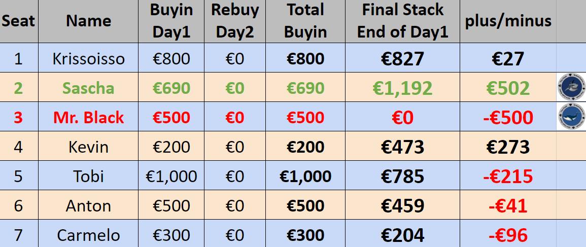 Damit durfte sich Geburtstagskind Sascha aka „Paul Panther“ über den Titel „The Shark“ und ein Plus von €657 freuen. Den Titel „The Whale“ bekam „Mr.Back“ überreicht, und er musste auch noch einen Verlust von €605 hinnehmen.