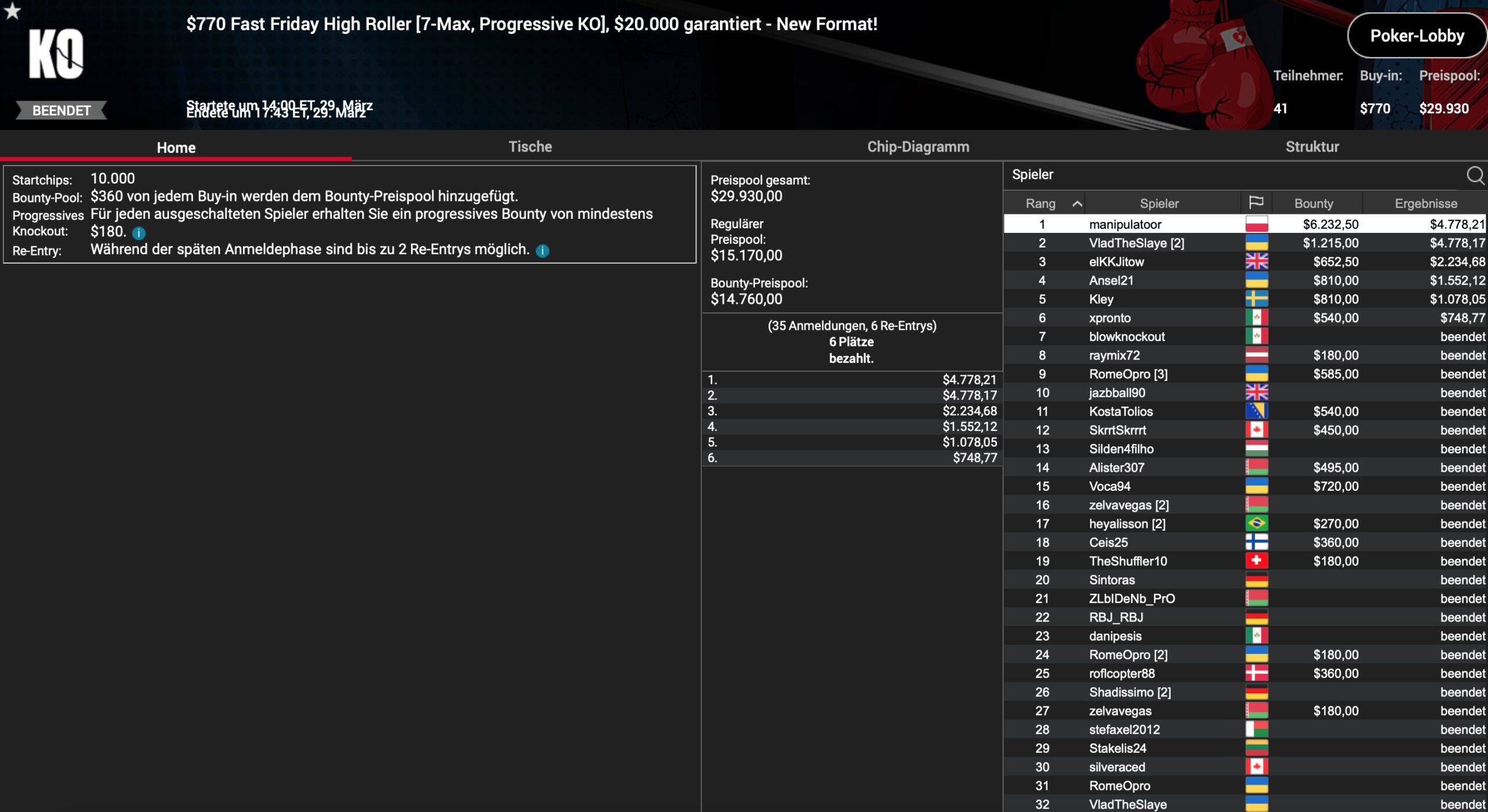 Das teuerste Turnier des Tages, das an Freitagen kein $1k, sondern das $770 Fast Friday ist, sah 41 Teilnahmen, die aus 35 Entries und 6 Re-Entries stammten. Damit landeten $29.930 im Prizepool, der zur Hälfte aus Bounties bestand. Nach 3 Stunden 45 Minuten Spielzeit setzte sich „manipulatoor“ aus Polen vor dem ukrainischen Online-MTT-Crusher Vlad „VladThe Slaye“ Martynenko durch. $11.010 gingen nach Polen, $5.993 in die Ukraine. – Für „manipulatoor“ sollte es nicht der einzige Tageserfolg bleiben, denn im gut frequentierten $109 Fenomeno sollte er unter 306 Total Entries noch einmal auf ganz oben auf dem virtuellen Podium landen. Für den Fenomeno-Sieg flossen noch einmal $5.783 in seine Bankroll!