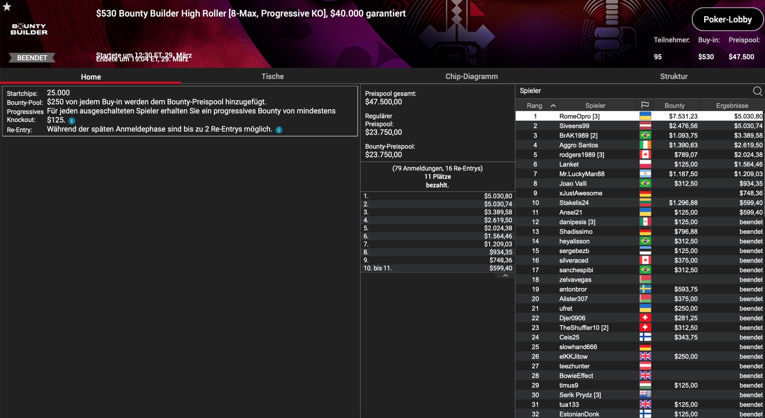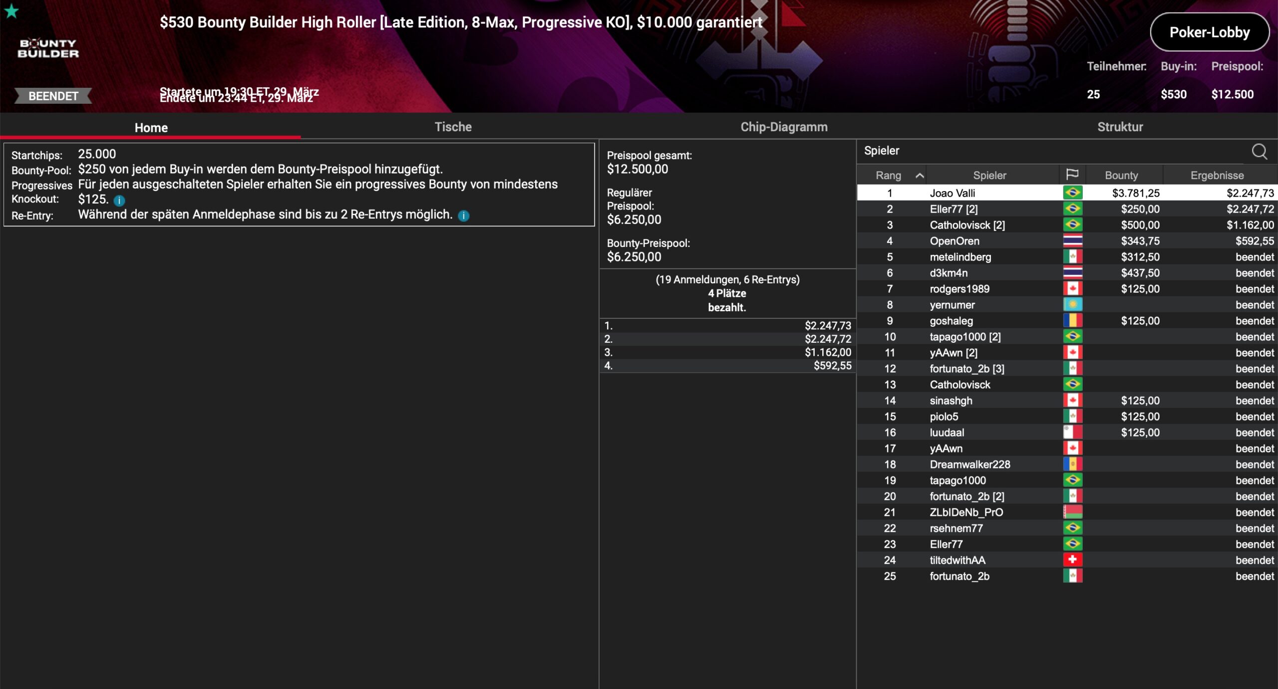 Die Late Edition des $530 Bounty Builders war dann (fast) eine rein brasilianische Angelegenheit. Die Top-3-Platzierungen gingen allesamt nach Südamerika. Den Sieg holte sich hier nach 4 Stunden 15 Minuten Spielzeit „Joao Valli“ für ein kombiniertes Payout von $6.028.