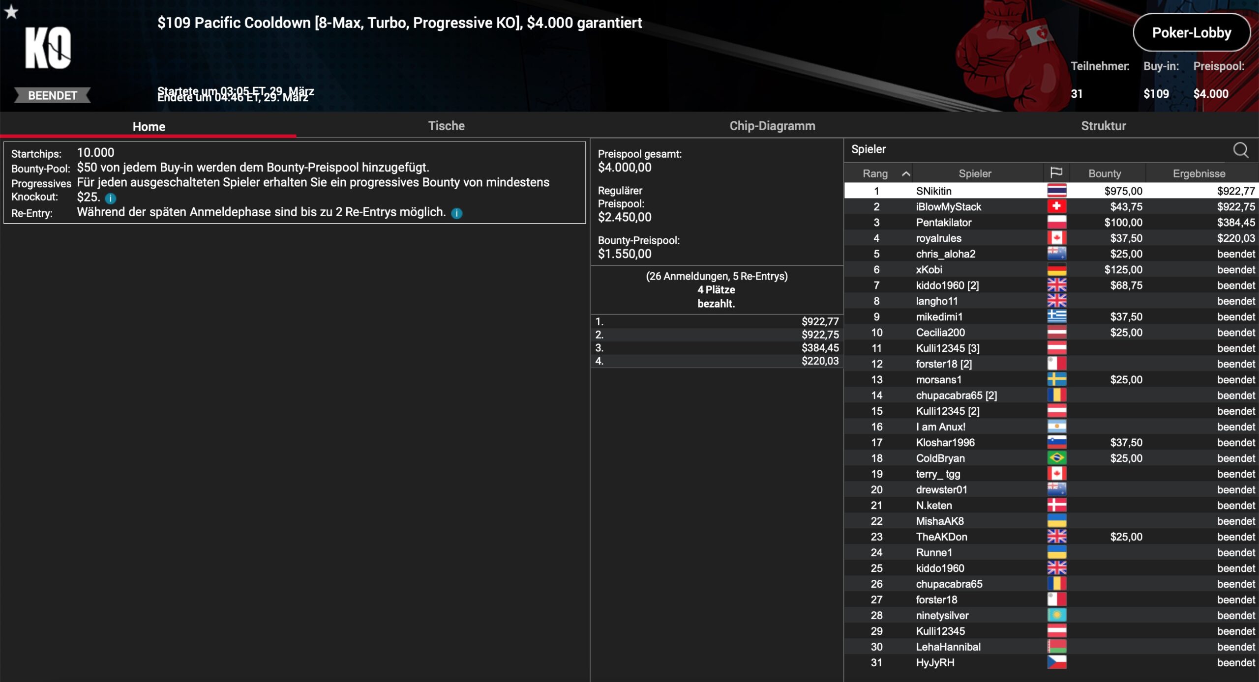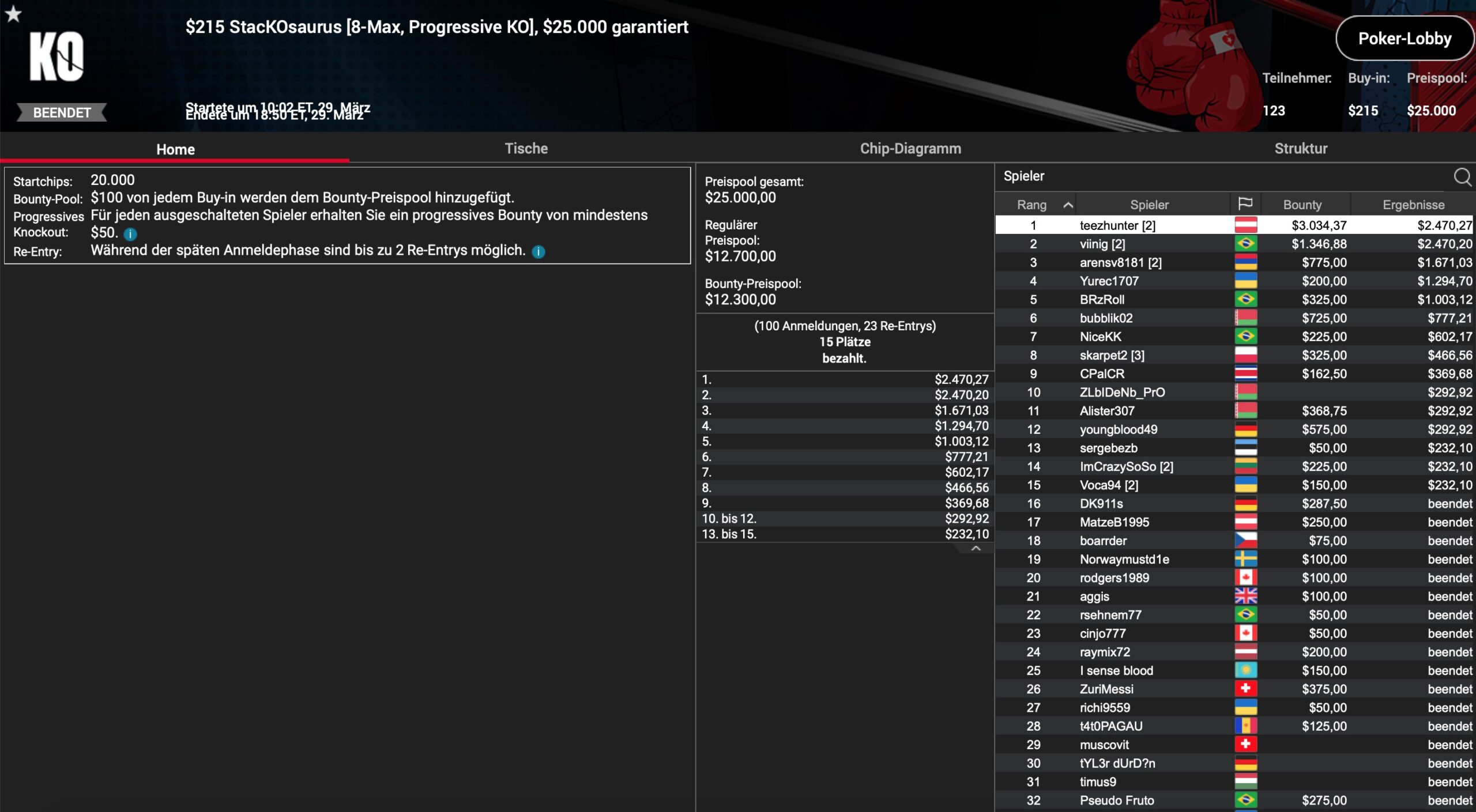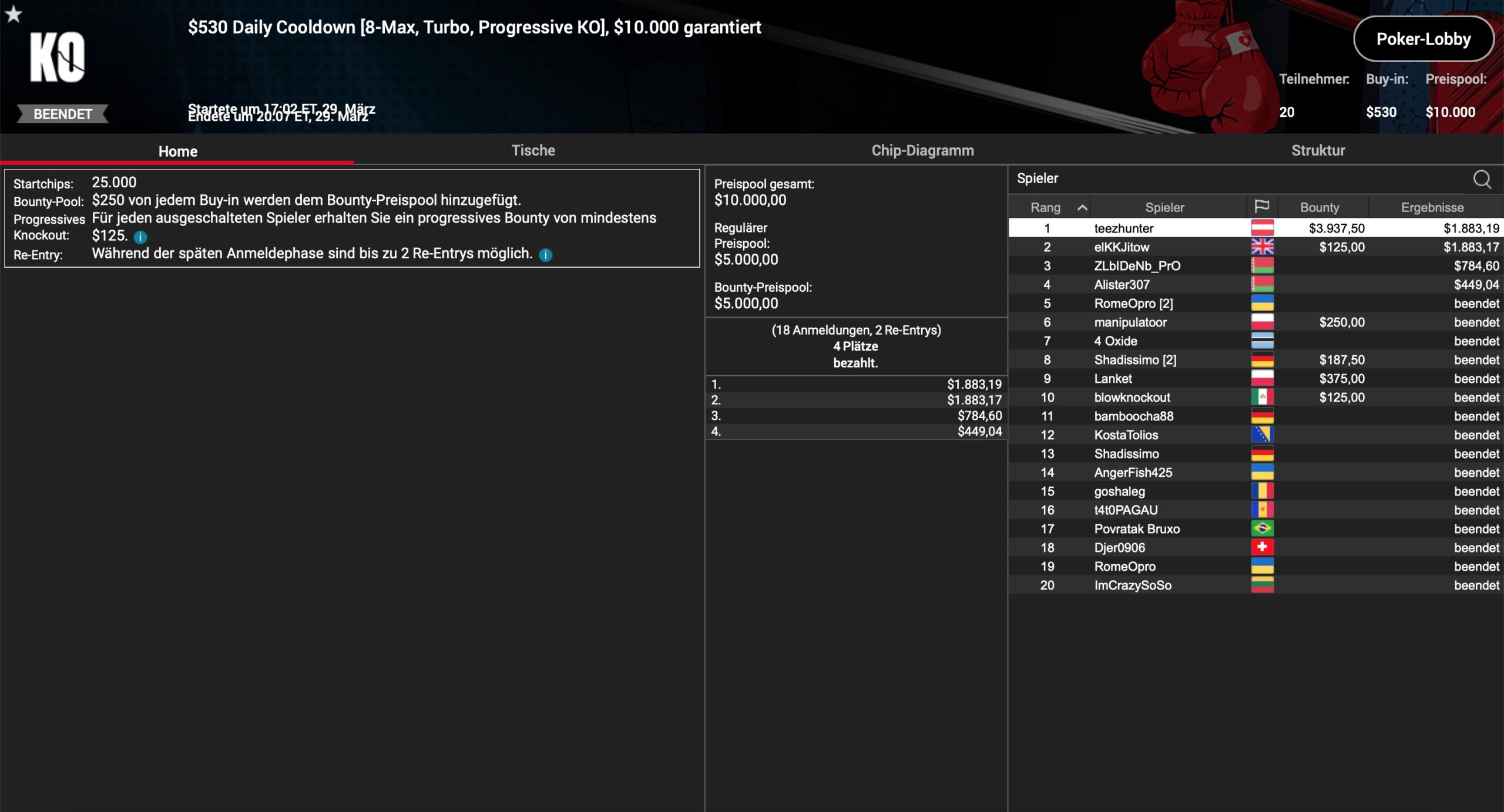Im $530 Dialy Cooldown war es dann „teezhunter“ aus Österreich, der seine 19 Kontrahenten an die Wand spielte. Fast alle Kopfgelder gingen in dem Turbo PKO an ihn. Für seinen Sieg nach 3 Stunden Spielzeit erhielt er $3.937 aus dem Bounty-Pool von $5.000 und noch einmal $1.883 Siegprämie aus dem $5k-Preispool.