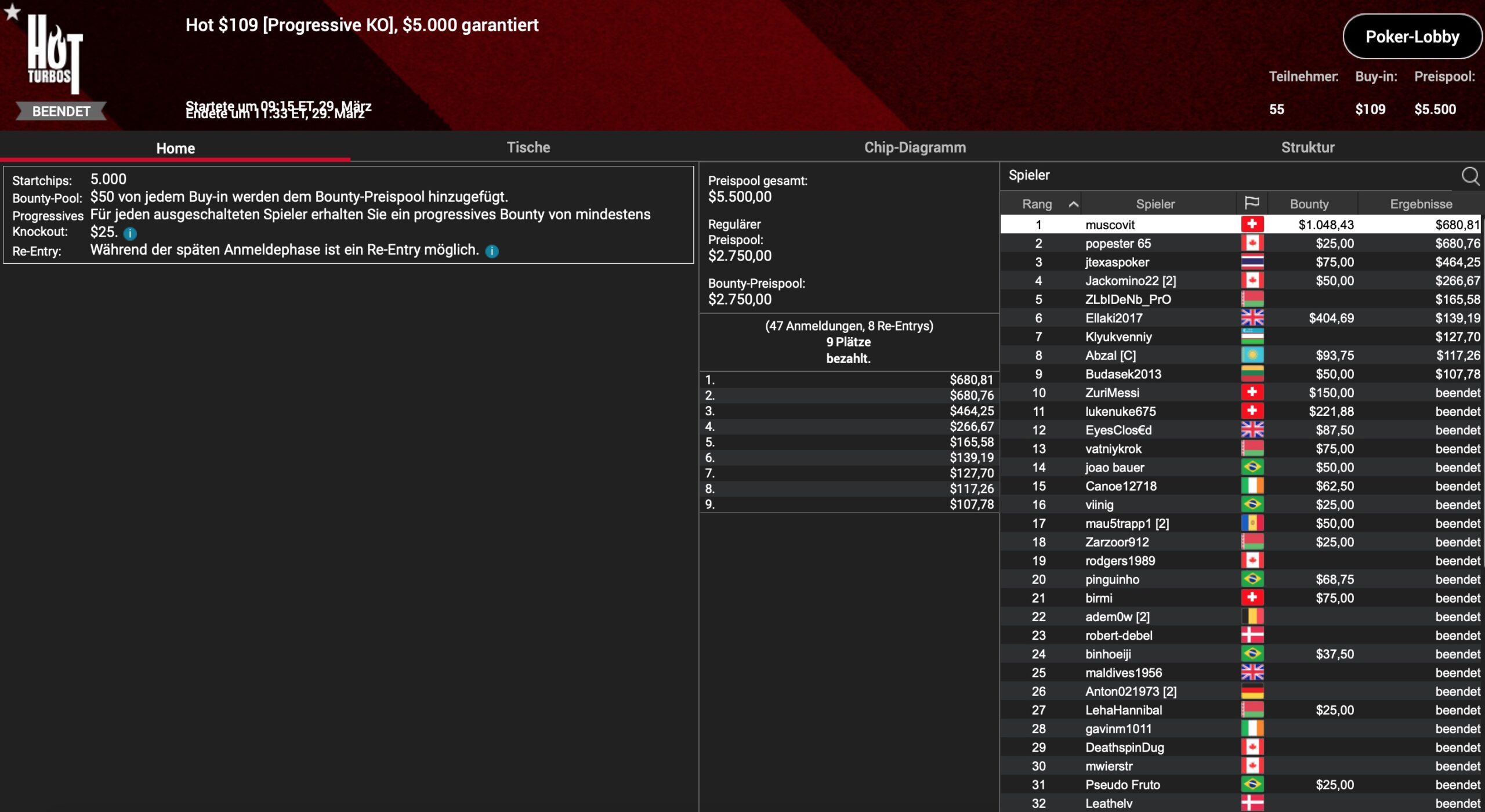 Das teuerste Turnier des Tages, das an Freitagen kein $1k, sondern das $770 Fast Friday ist, sah 41 Teilnahmen, die aus 35 Entries und 6 Re-Entries stammten. Damit landeten $29.930 im Prizepool, der zur Hälfte aus Bounties bestand. Nach 3 Stunden 45 Minuten Spielzeit setzte sich „manipulatoor“ aus Polen vor dem ukrainischen Online-MTT-Crusher Vlad „VladThe Slaye“ Martynenko durch. $11.010 gingen nach Polen, $5.993 in die Ukraine. – Für „manipulatoor“ sollte es nicht der einzige Tageserfolg bleiben, denn im gut frequentierten $109 Fenomeno sollte er unter 306 Total Entries noch einmal auf ganz oben auf dem virtuellen Podium landen. Für den Fenomeno-Sieg flossen noch einmal $5.783 in seine Bankroll!