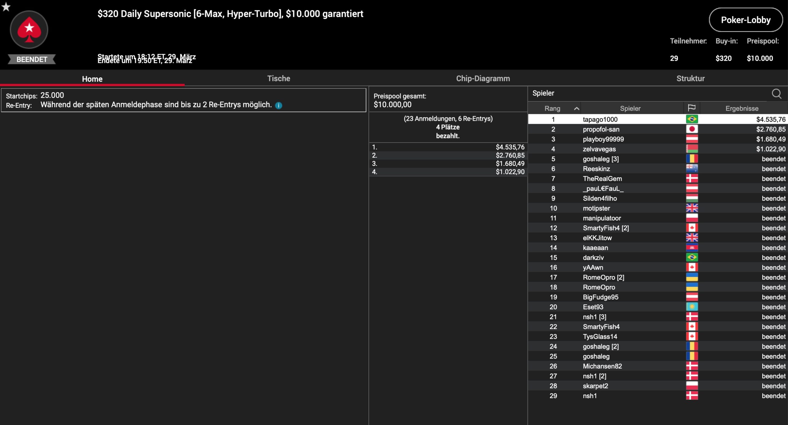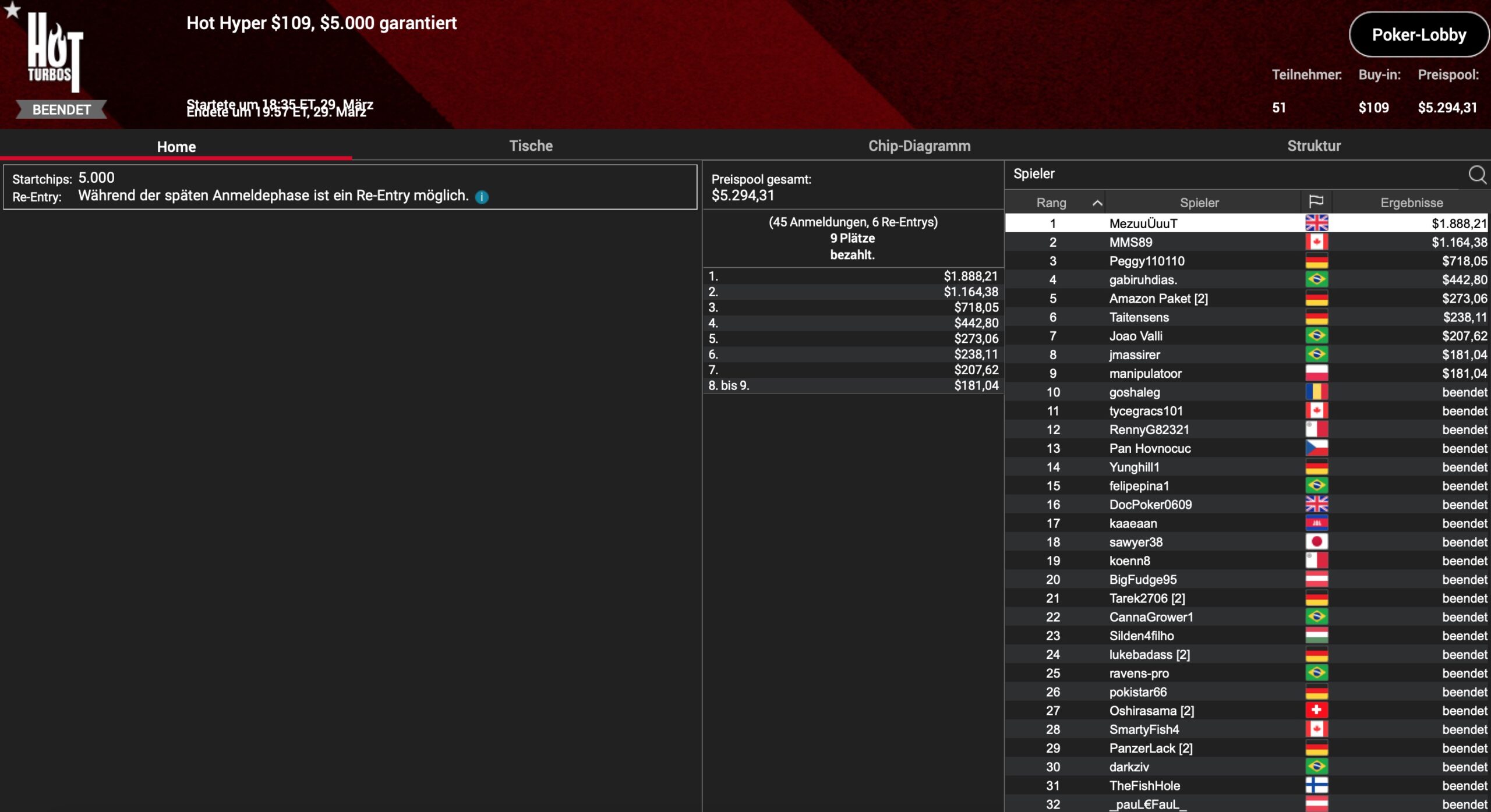 Weitere Top-Platzierungen der D-A-CH-Community holten „iBlowMyStack“ ($966) als 2. von 31 im $109 Pacific Cooldown, „Peggy110110“ ($718) als 3. von 51 im Hot Hyper $109 und Markus „playboy99999“ Prinz ($1.680) als 3. von 29 im $320 Daily Supersonic.