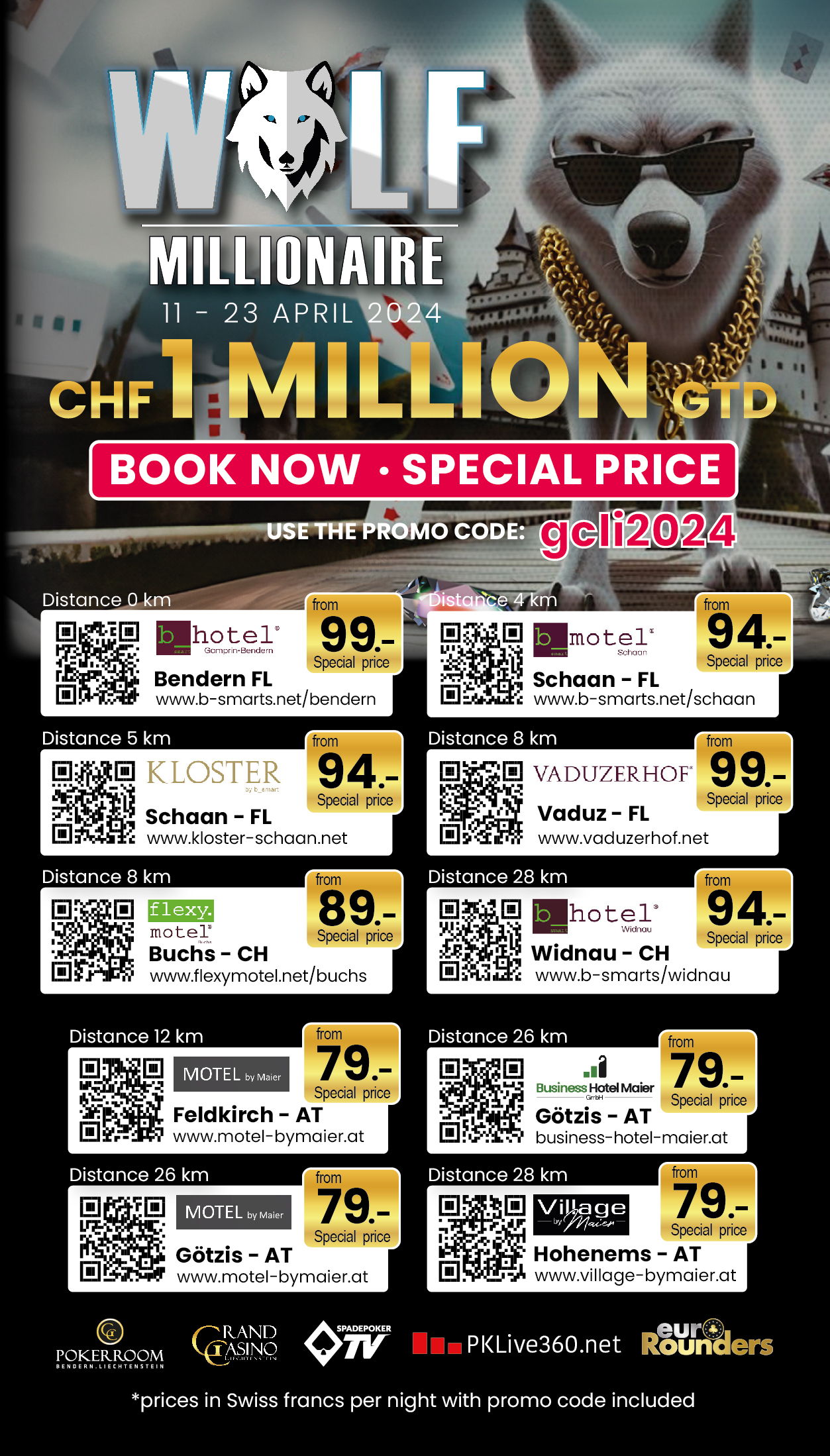 Wer nach einer geeigneten Unterkunft für das WOLF Millionaire Poker Festival sucht, sollte in den Partner Hotels des Grand Casino Liechtensteins nicht nur gut untergebracht werden, sondern mit dem Promo Code gcli2024 auch einen Special Price für die Übernachtungen bekommen. Und wo nimmt man Extra Value lieber mit als bei einem Poker Festival?