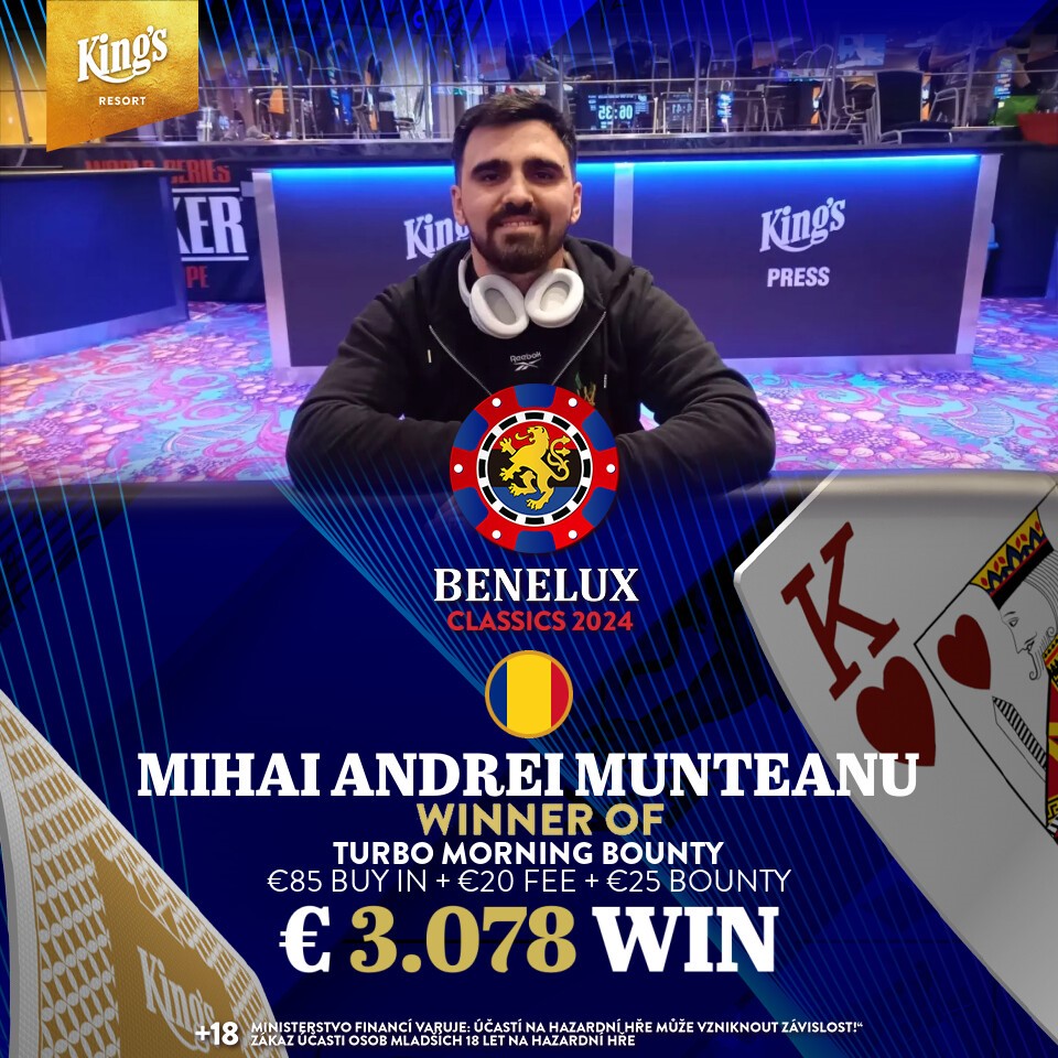 Gestern gab es im King’s Resort Rozvadov um 12:00 Uhr das €130 Turbo Morning Bounty mit einer €10.000 Garantie. 91 Entries sorgten dafür, dass diese knapp verfehlt wurde. Elf Spieler teilten sich den Preispool untereinander auf und als Sieger wurde der Rumäne Mihai Munteanu gekrönt. Er konnte €3.078 mit nach Hause nehmen.