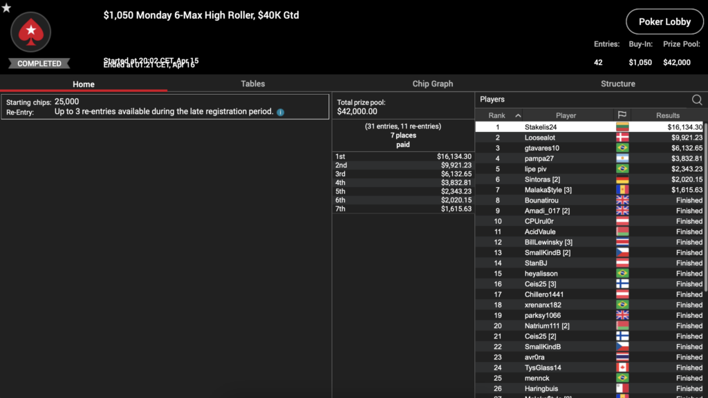 Das größte Event am gestrigen Montag war das $1.050 Monday 6-Max High Roller mit einer $40k Garantie. 31 Entries und 11 Re-entries sorgten dafür, dass auch dieses Event seine Garantie übertreffen konnte. Der Preispool von $42.000 wurde unter den besten sieben Spielern aufgeteilt und der größte Anteil ging nach Litauen. ‚Stakelis24‚ erhielt $16.134 für seine Mühen.