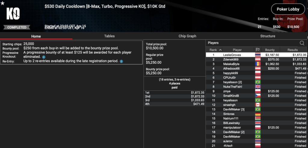 Als letztes Turnier im Bunde der High Roller was das $530 Daily Cooldown ($10k GTD). PokerStars wird sich freuen, denn auch dieses Turnier knackte die Garantie, zwar nur knapp, aber knapp geknackt, ist auch geknackt. Die 21 Entries sorgten für einen $10.500 Preispool, der auf vier bezahlte Plätze verteilt wurde. Als Sieger konnte ein weiterer Thailänder gekrönt werden. ‚LeslieGroves‚ konnte $1.872 plus $3.187 an Bounties mit nach Hause nehmen.